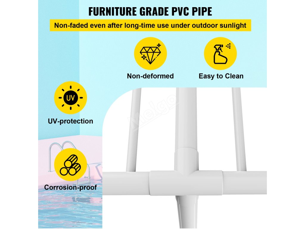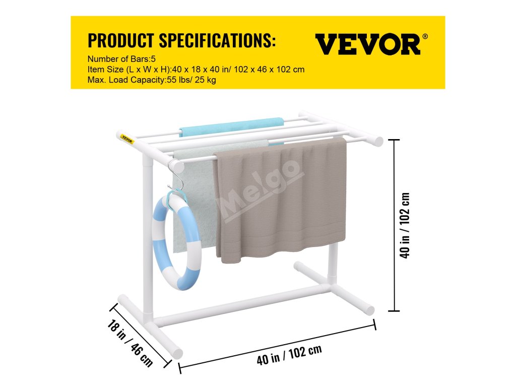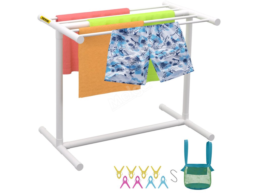 Venkovní věšák na ručníky má konstrukci z PVC trubek, díky které je odolný a přenosný a zaručuje dlouhodobé používání.