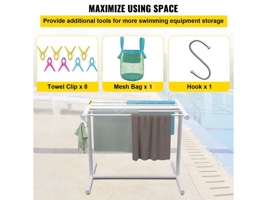 Tento stojan na ručníky k bazénu je ideálním nástrojem pro ukládání plaveckého vybavení v interiéru i exteriéru.
