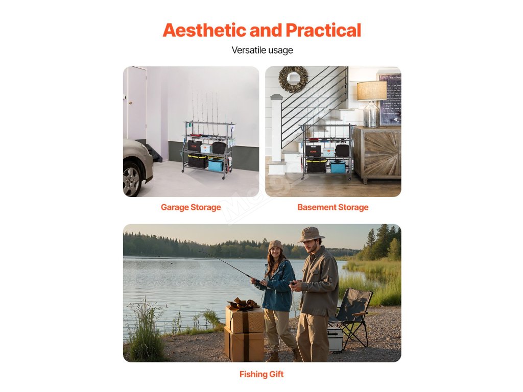 Stojan na rybárske prúty má viacvrstvovú konštrukciu, ktorá poskytuje dostatok úložného priestoru na udržanie poriadku v rybárskom vybavení. Je ideálny na uloženie boxov na náčinie, návnad, navijakov a ďalších potrebných vecí.
