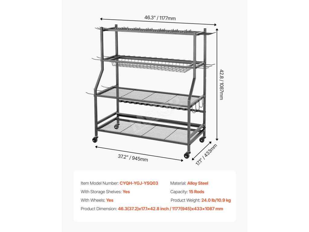 Stojan na rybářské pruty na 15 prutů, mobilní s kolečky do garáže