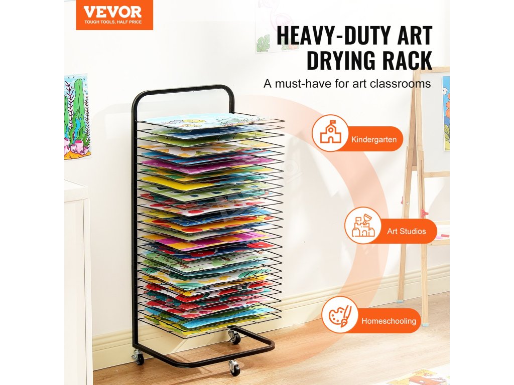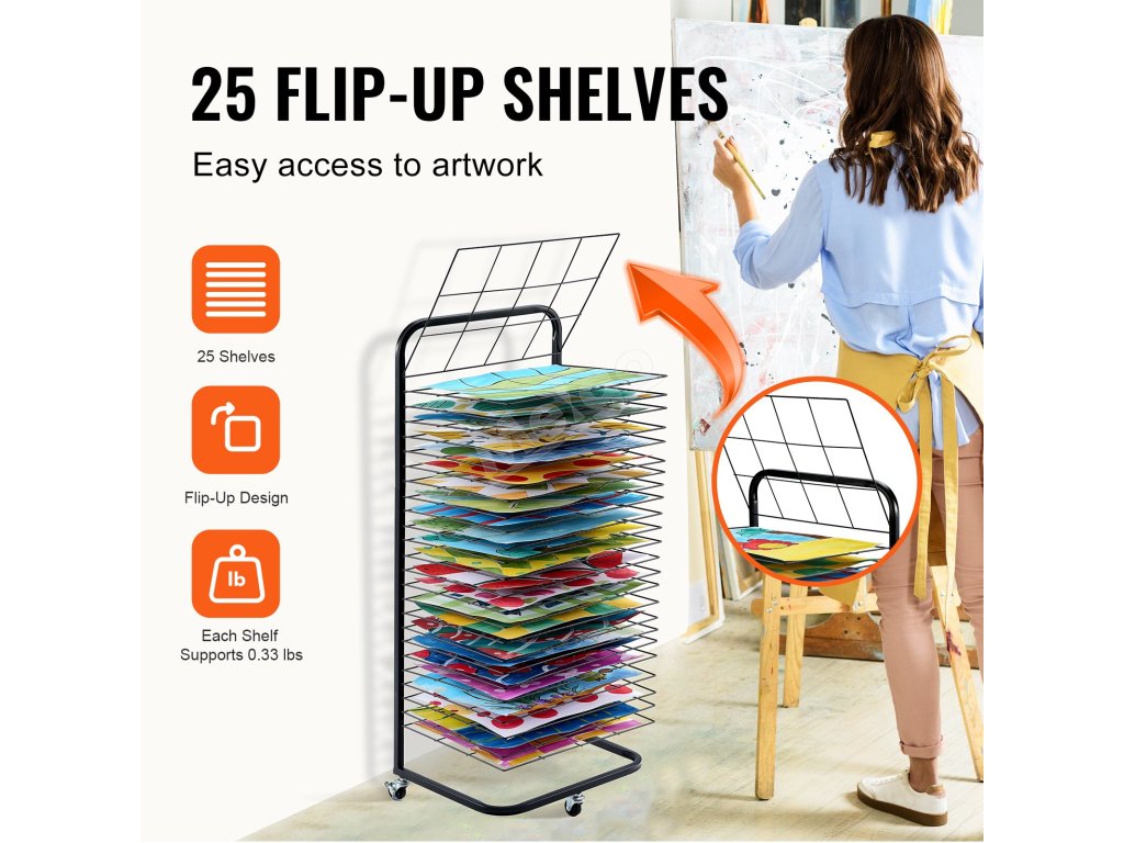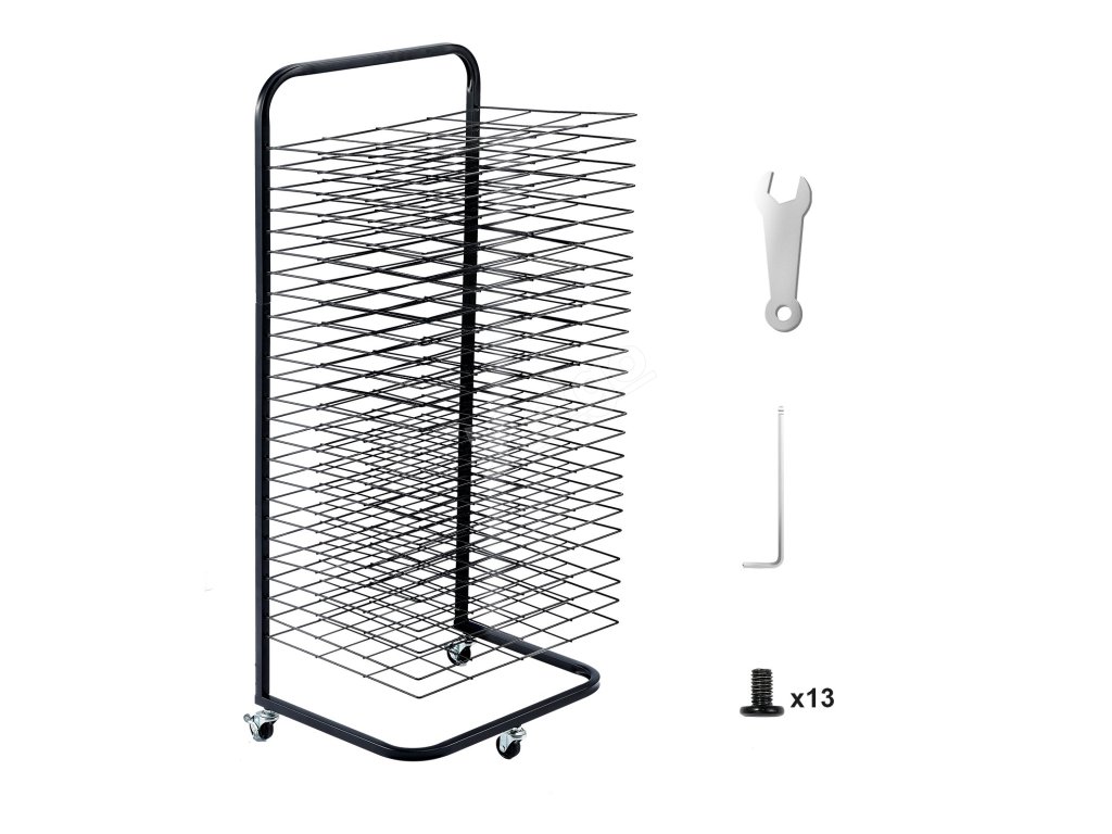 Všetkých 25 políc je nastaviteľných tak, aby vyhovovali rôznym potrebám sušenia, a umožňuje jednoduché vkladanie alebo vyberanie, aby sa zabránilo rozmazaniu mokrých umeleckých diel. Kovová konštrukcia s práškovou povrchovou úpravou zaisťuje hladký každý roh, čím zabraňuje poškriabaniu a zároveň je odolná a estetická.