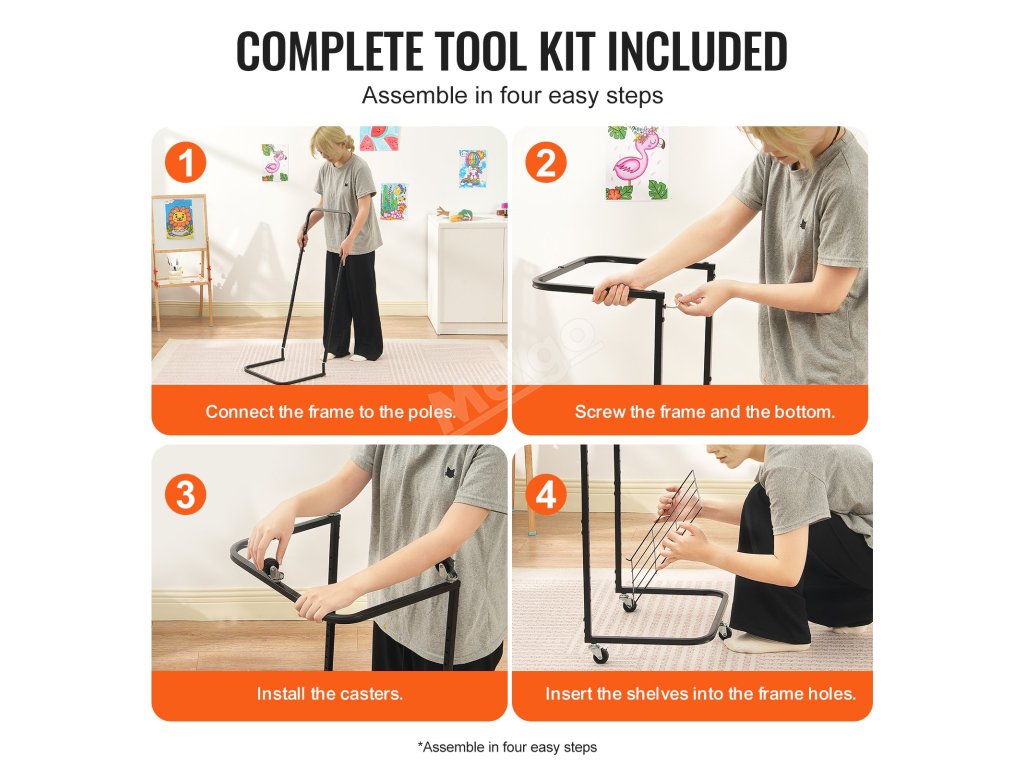 Jednoducho dokončite nastavenie v štyroch krokoch. Stojan na sušenie umeleckých diel pre učebne obsahuje sadu nástrojov na inštaláciu a návod, takže nie sú potrebné žiadne ďalšie nástroje. Po rýchlej demontáži zaberá minimum miesta, zmestí sa aj do rohov, znižuje neporiadok vo vašej domácnosti a udržiava poriadok v priestore.