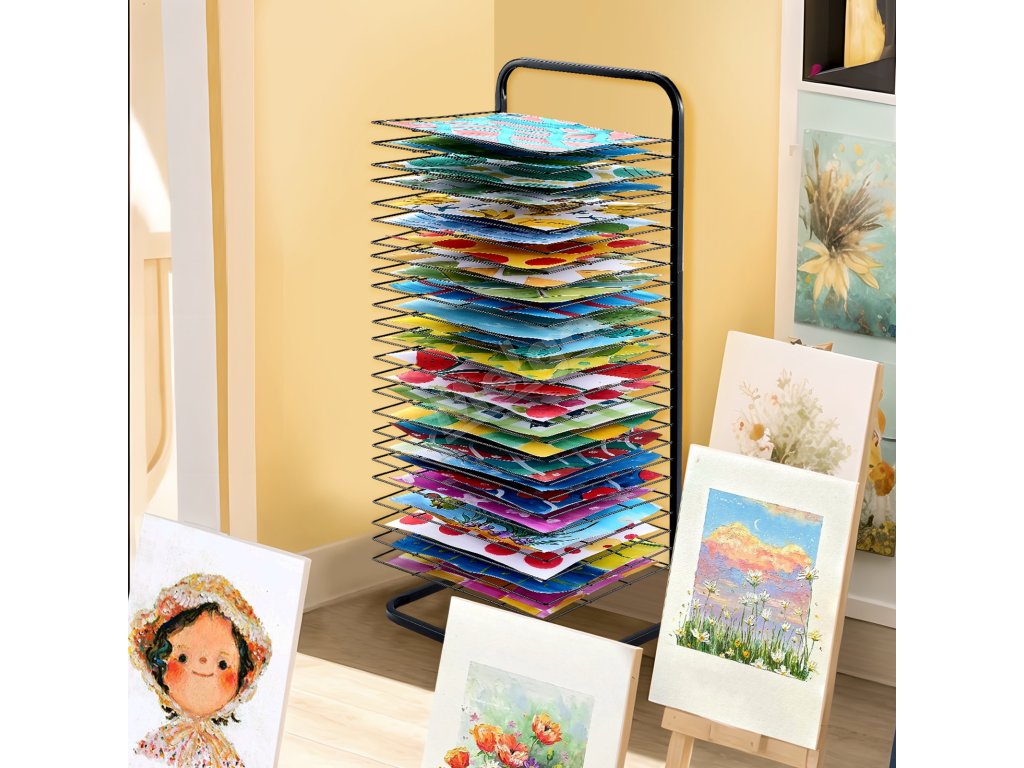 Tento stojan na sušenie obrazov, ktorý je celý vyrobený z kovu, je konštruovaný tak, aby udržal veľké množstvo umeleckých diel bez toho, aby sa ohýbal alebo deformoval. Do políc možno umiestniť rôzne veľkosti papiera vrátane formátov A4, A3 a A2. Aj pri plnom zaťažení si zachováva stabilitu bez rizika zrútenia.