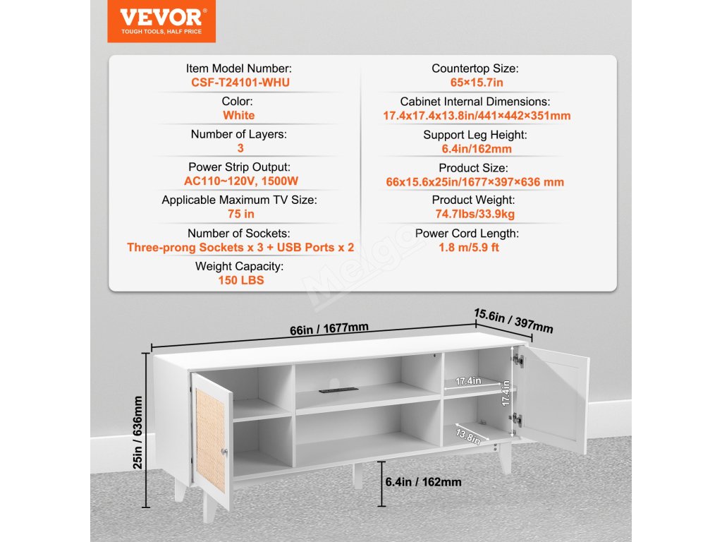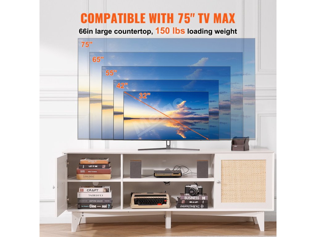 Na stůl o rozměrech 165 x 40 cm se vejde televizor o úhlopříčce 191 cm a unese až 68 kg. Pokud se ratanové zábavní centrum nepoužívá pro televizor, je ideální také pro vystavení dekorativních předmětů.