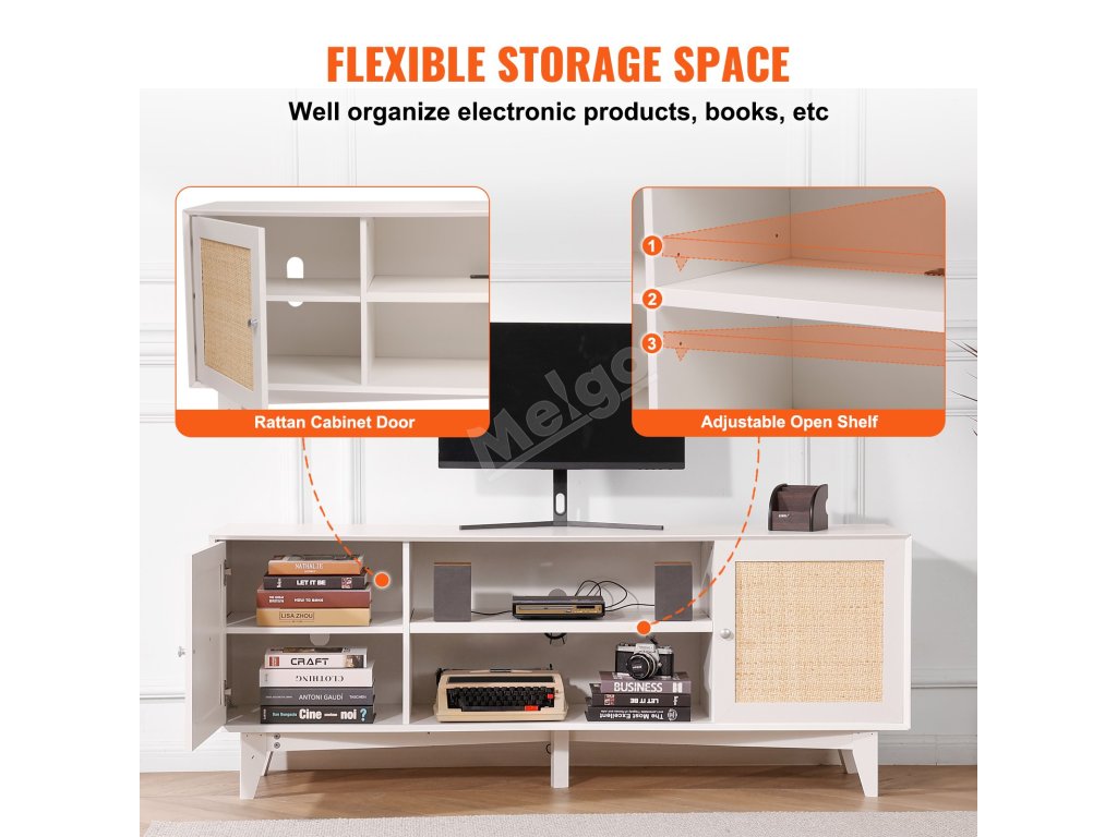 Díky velkým ratanovým skříním na obou stranách poskytuje soukromí a organizaci. Prostřední otevřená police je výškově nastavitelná od 0 do 64 mm a nabízí dostatek úložného prostoru pro DVD, audio zařízení, CD a knihy.