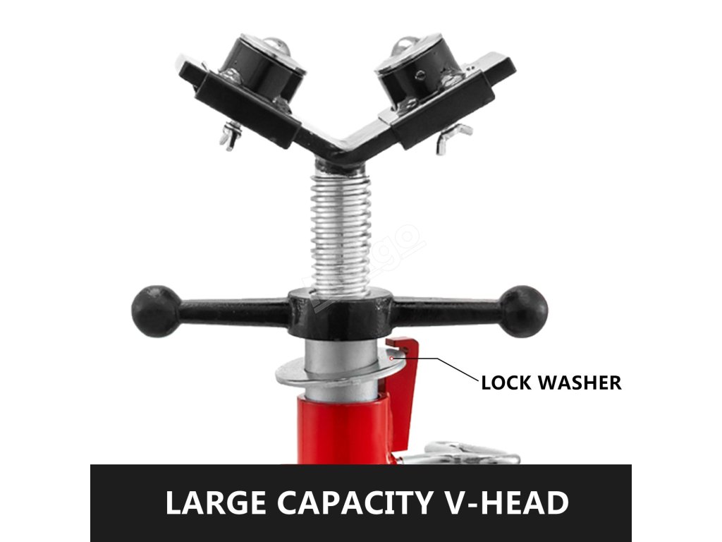 Hlava ve tvaru V s přenosem 2 kuliček, snadná instalace. Rychloupínací podložka je vyrobena pro rychlé nastavení výšky. Nastavovací šroub pro bezpečnost po nastavení výšky, maximální zvedací hmotnost může být až 2500 lbs.