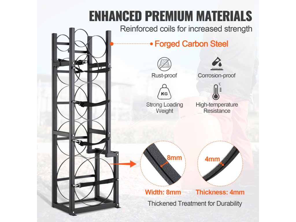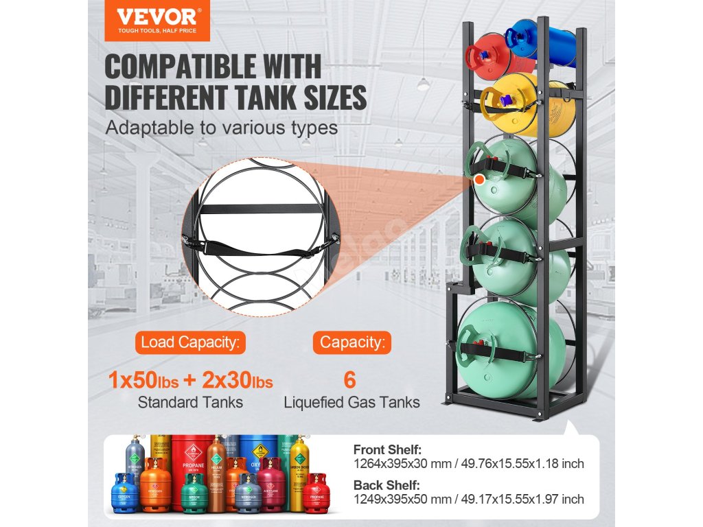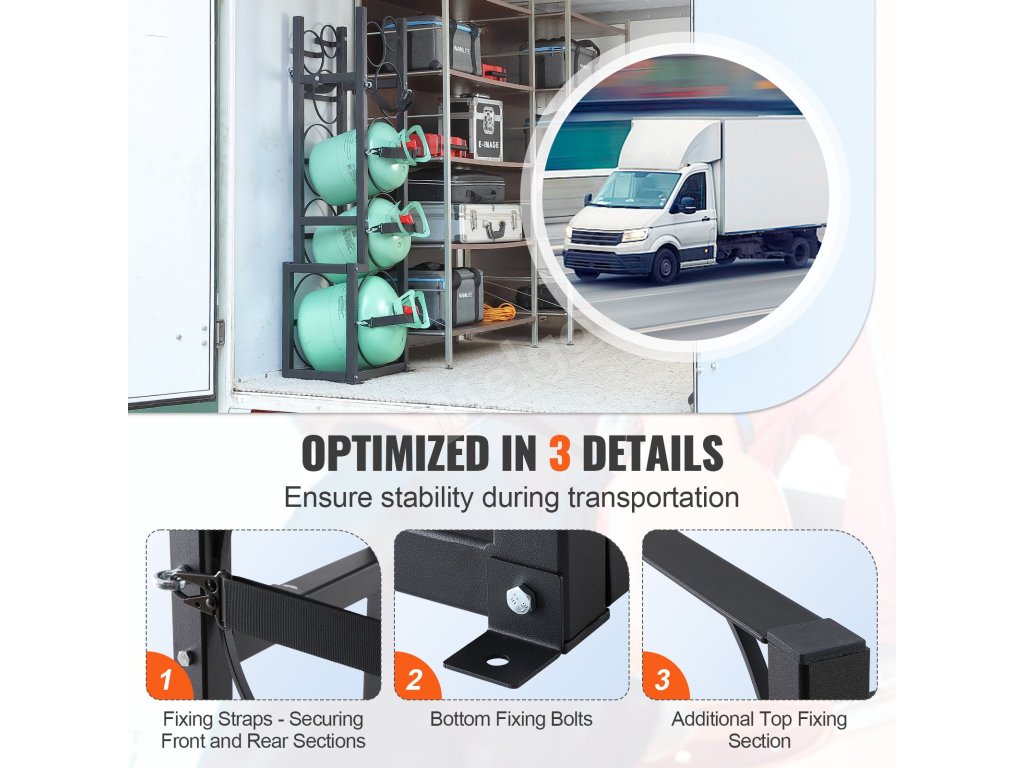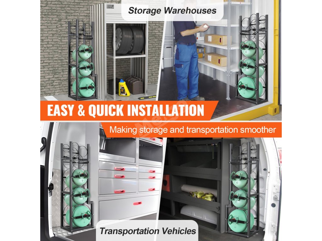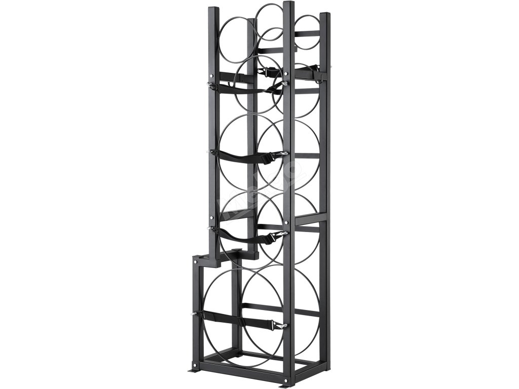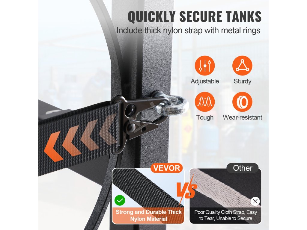 Pro zlepšení stability a kompatibility s různými velikostmi nádrží je tento stojan na láhve s chladicí kapalinou vybaven nastavitelnými montážními popruhy a spodními šrouby. Pojme 1x50 lbs, 2 x 30 lbs nádrže a 3 další malé lahve s nádržemi. Bezpečně uložte nádrže a zároveň maximalizujte využití prostoru.