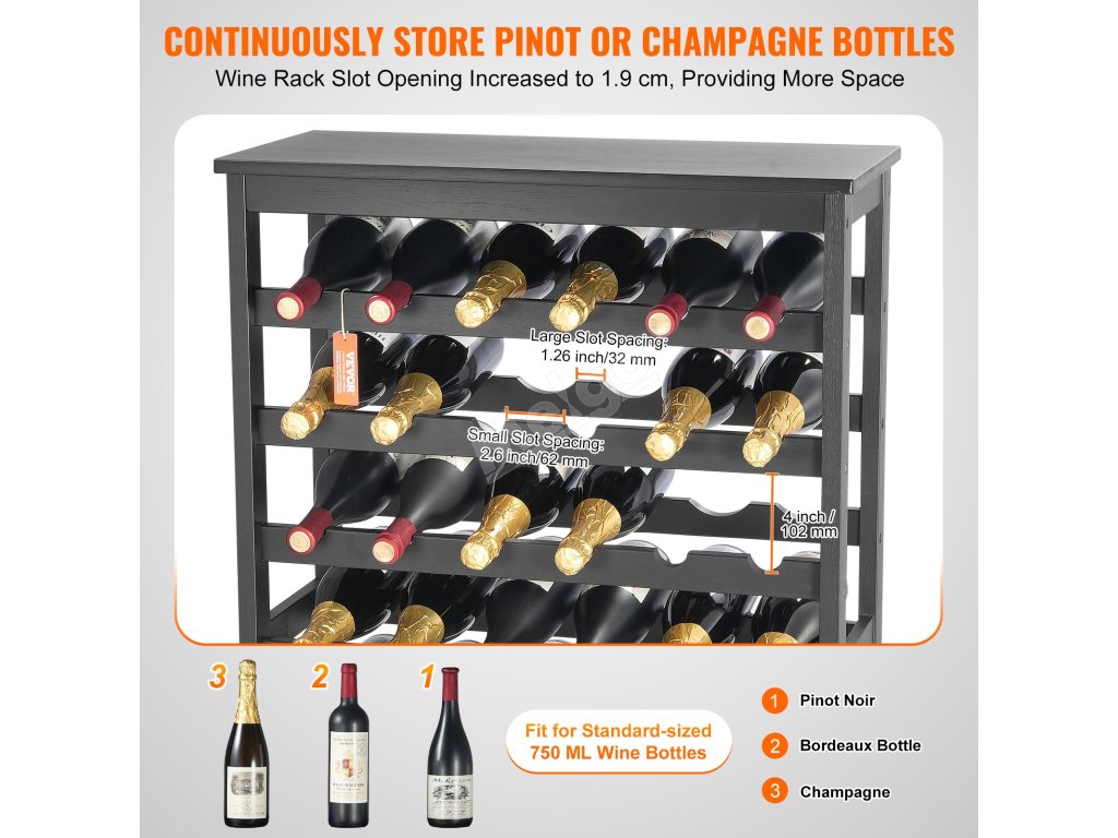 Vhodné pro láhve standardní velikosti (750 ml), jako je Bordeaux a šampaňské. Je vhodný pro 90 % velikostí lahví na trhu. Výška mezi policemi byla zvýšena na 4 palce pro snadnější přístup k vašim oblíbeným lahvím.