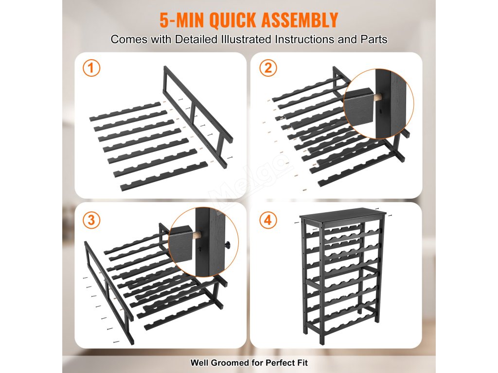 Stačí podle jednoduchých pokynů utáhnout šrouby a bambusový stojan na víno ihned sestavit. Pokud potřebujete stojan přemístit, nezapomeňte nejprve vyjmout lahve.