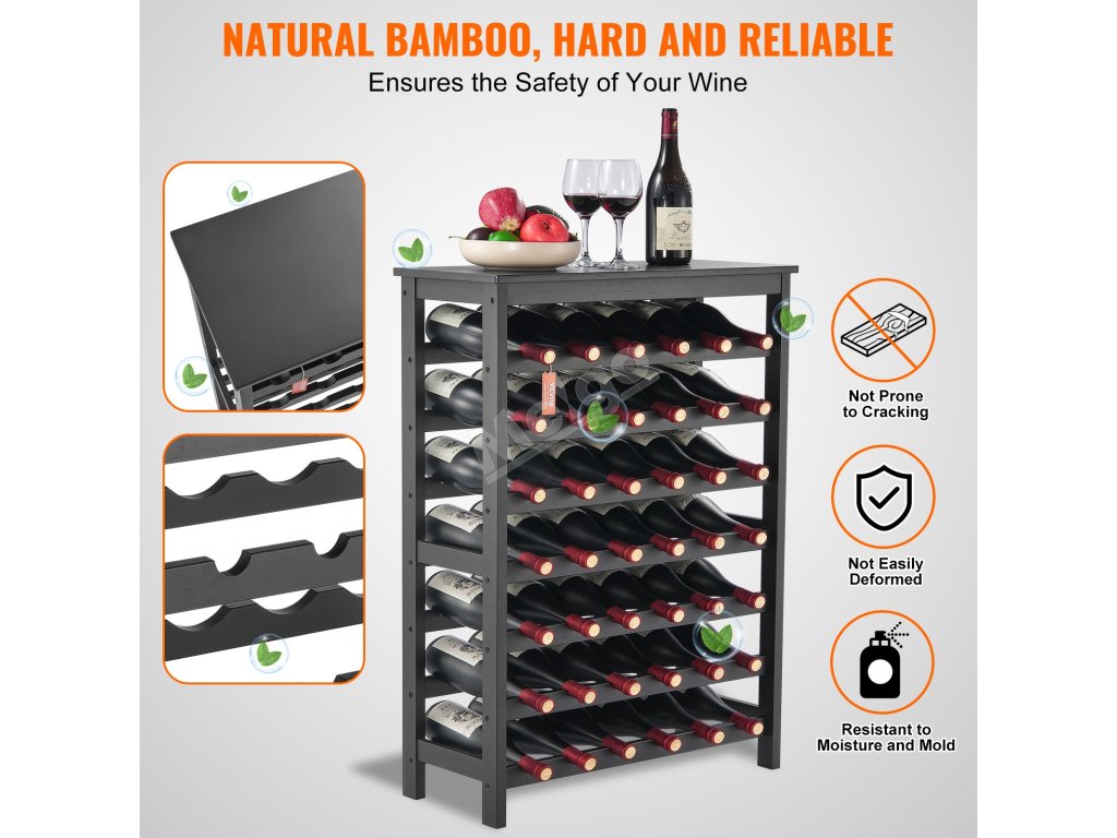 Tento stojan na víno je vyroben z prvotřídního bambusu, je hladký a odolný proti praskání. Bambusový rám je zajištěn šrouby, které poskytují dokonalou oporu lahvím vína, aniž by se kývaly. Na horní polici lze umístit sklenice na víno, tvarované láhve nebo ozdoby.