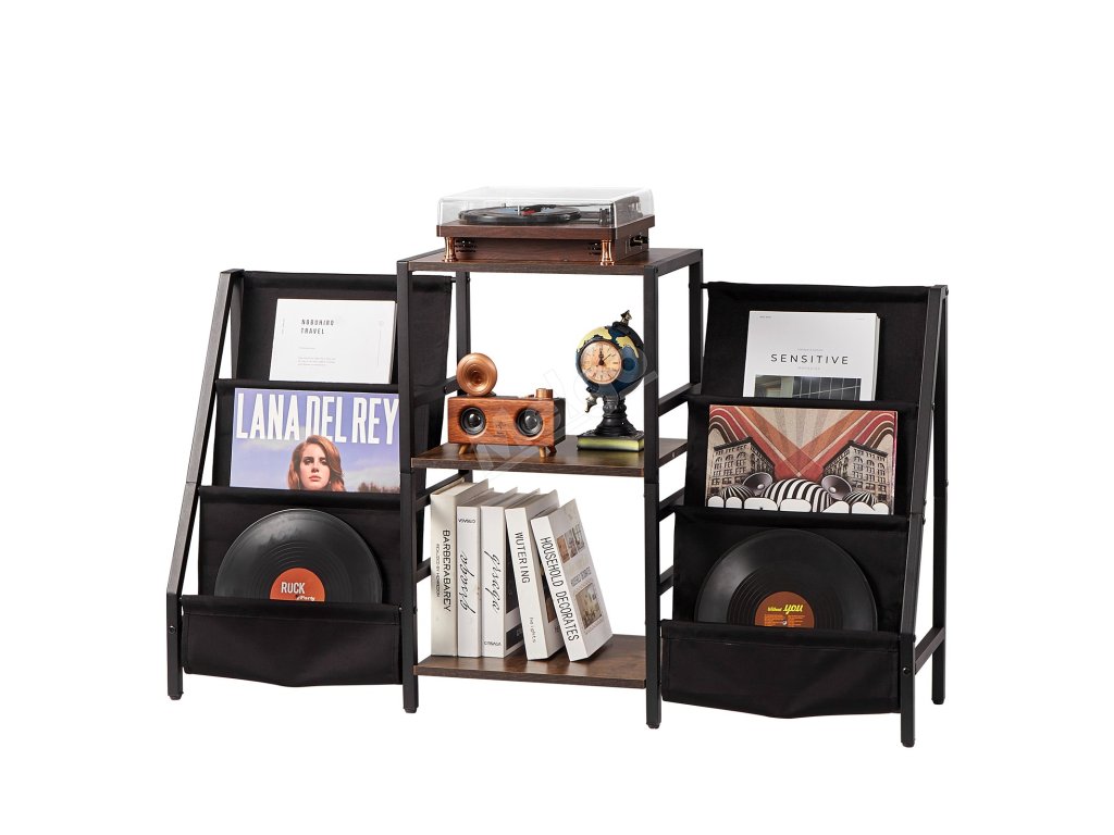 Stojan na vinylové desky a gramofon, 3 úrovně kovový, dřevěný držák
