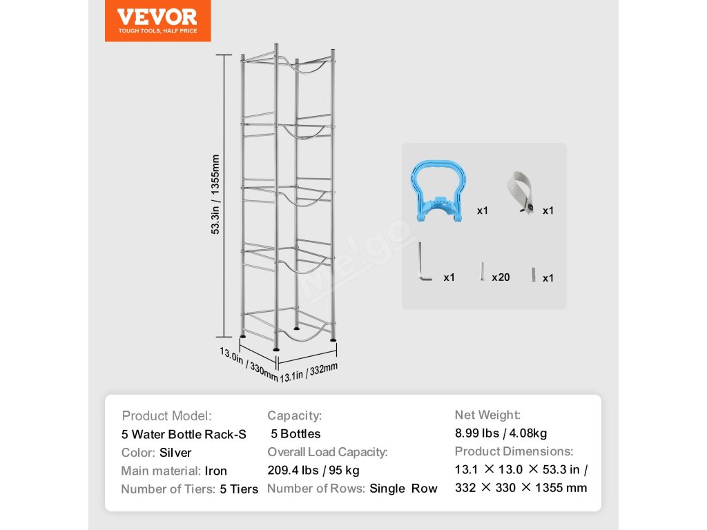 Tento pětipatrový držák na džbány na vodu má rozměry 13 x 13 x 53,3 palce, pojme až 5 lahví a unese až 209,4 kg. Jeho minimalistický průmyslový design se hodí do různých interiérů, takže je ideální volbou pro jakýkoli prostor.