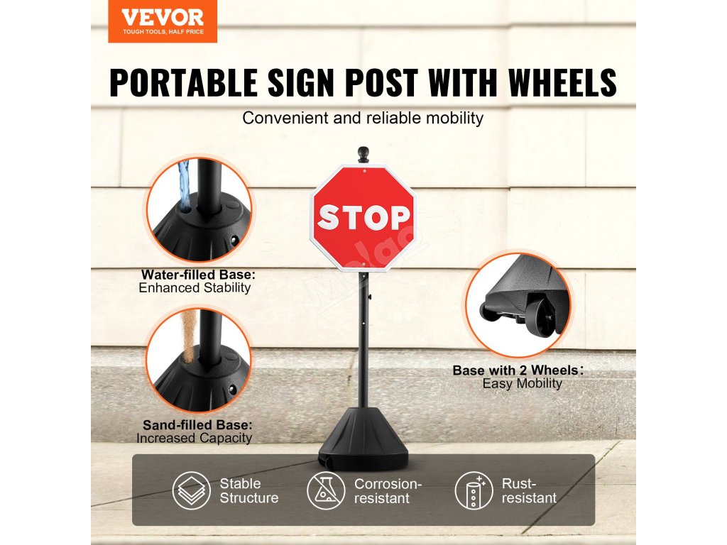 Instalace tohoto přenosného držáku na reklamní sloupky je pohodlná a snadná, nevyžaduje žádné speciální nářadí ani namáhavé kopání. Jednoduše vložte sloupek do země, sestavte základnu spojením obou částí a naplněním vodou nebo pískem a poté značku upevněte pomocí šroubů.
