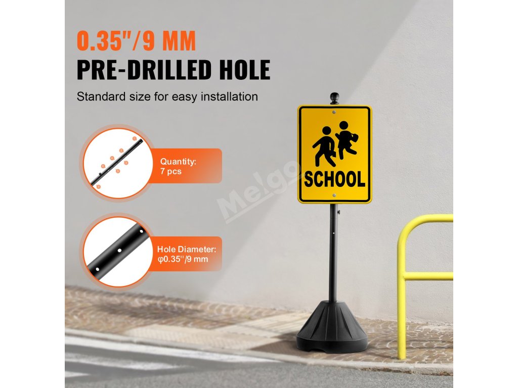 Tento přenosný sloupek je předvrtán se standardními rozměry otvorů a roztečí pro všechny výšky sloupků, což umožňuje snadné vyrovnání a instalaci značení.