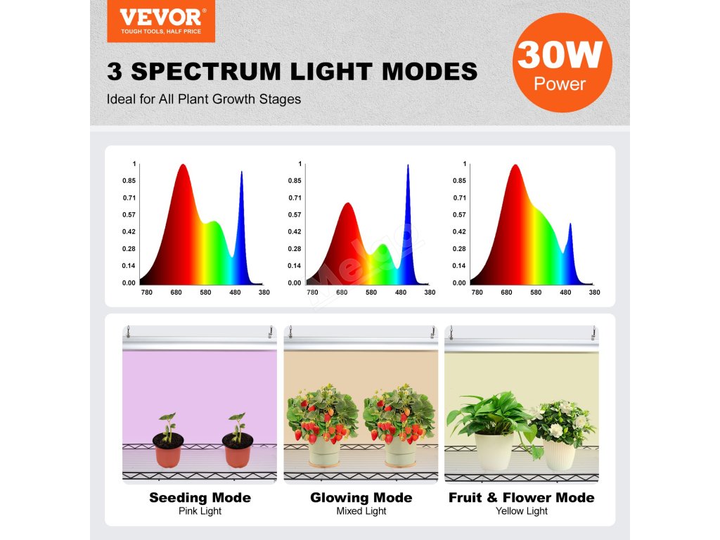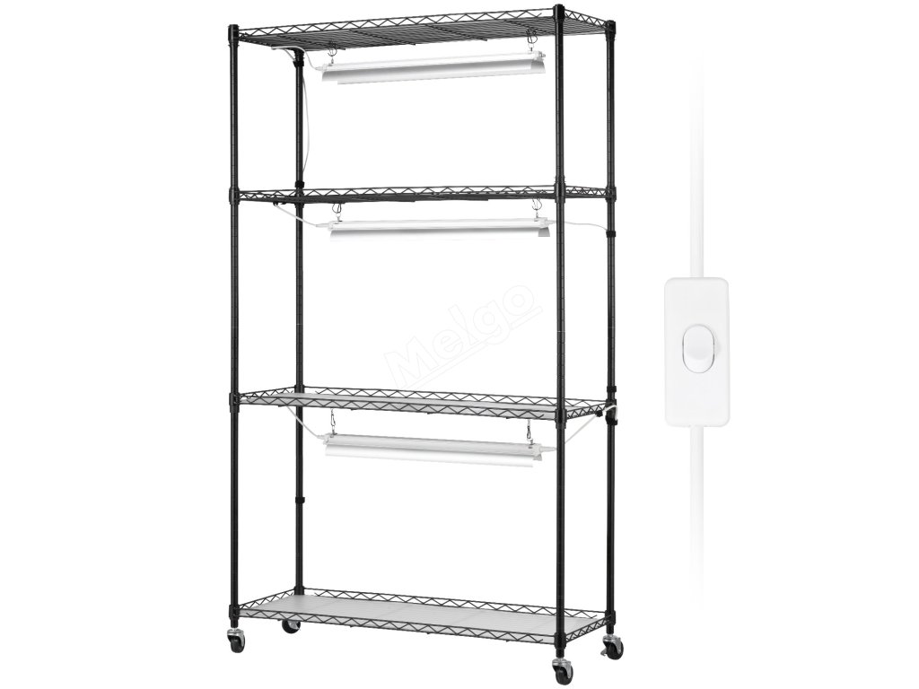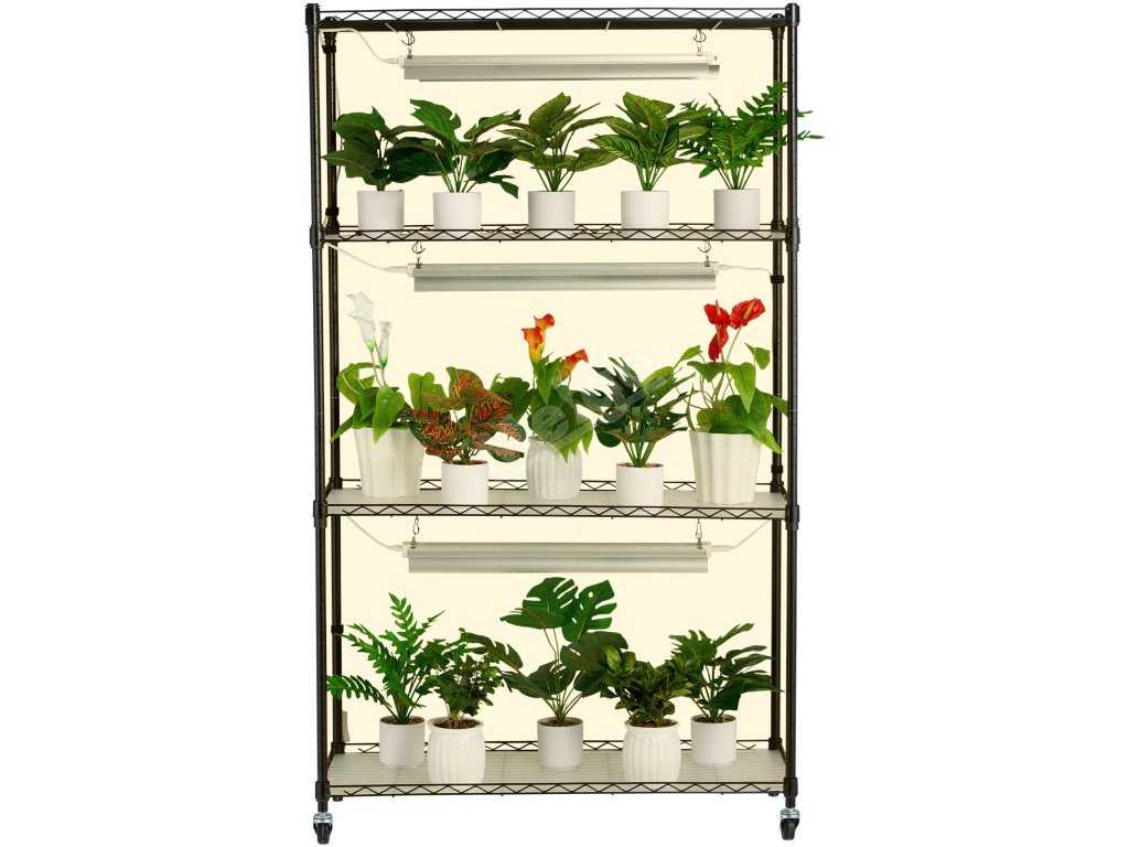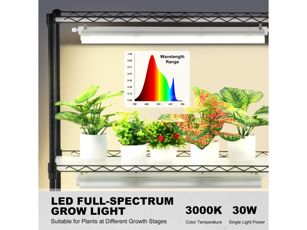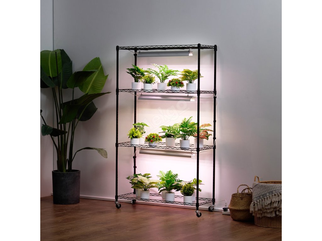 Tento robustní stojan na rostliny je vybaven 90W LED panely s plným spektrem 400-780 nm a 3 nastavitelnými barvami světla. Je vyroben z oceli s vysokou hustotou, odolné proti rzi a oxidaci. Má rozměry 35,4 x 13,8 x 59 palců se 4 policemi a unese až 240 kg, pro vystavování rostlin v kompaktních prostorách.
