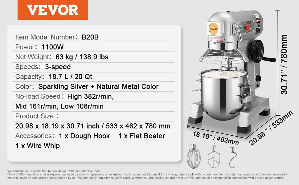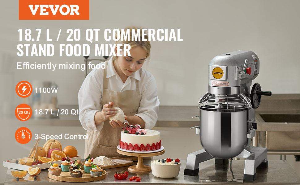 Komerční mixér VEVOR s mixovací nádobou o objemu 18,7 l, ideální pro mixování velkého množství potravin najednou. Je vybaven výkonným motorem se 3 nastavitelnými rychlostmi (vysoké 382 ot./min, střední 161 ot./min, nízké 108 ot./min) a dodává se se 3 mixovacími nástavci pro snadné zpracování různých ingrediencí.