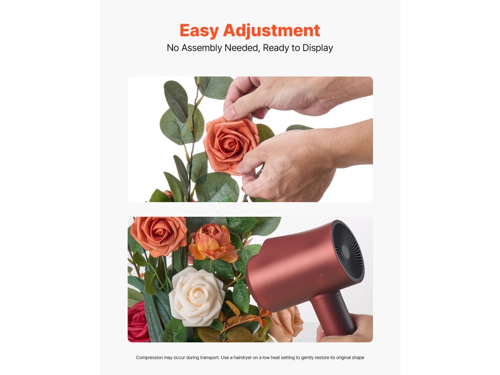 A2: Ano, každá květinová koule je pro vaše pohodlí kompletně sestavena. Vzhledem k balení může dojít k mírnému stlačení. Jednoduše použijte fén na několik sekund na nízkou teplotu a jemně rozložte okvětní lístky rukou, abyste obnovili jejich tvar.