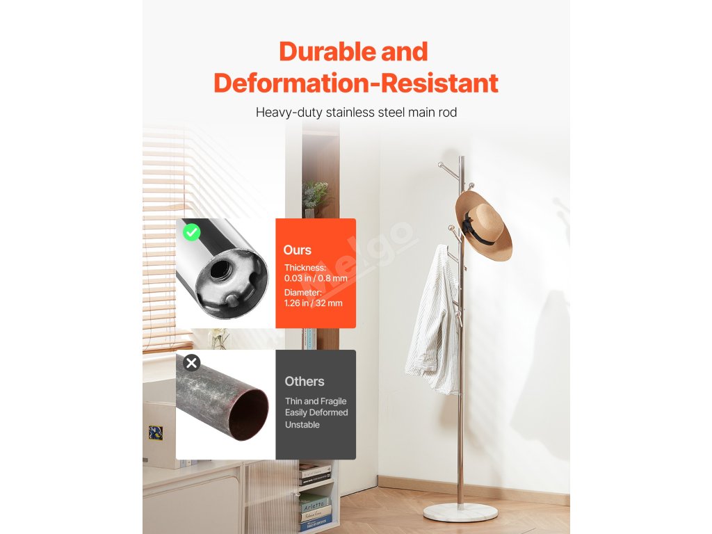 Proč je náš volně stojící věšák na oblečení tak stabilní a odolný? Je vybaven zesílenou hlavní tyčí z nerezové oceli, mramorovou základnou s protiskluzovou úpravou a protiskluzovými spodními podložkami - bezpečně udrží kabáty, tašky i klobouky a stane se nepostradatelným doplňkem vaší domácnosti.