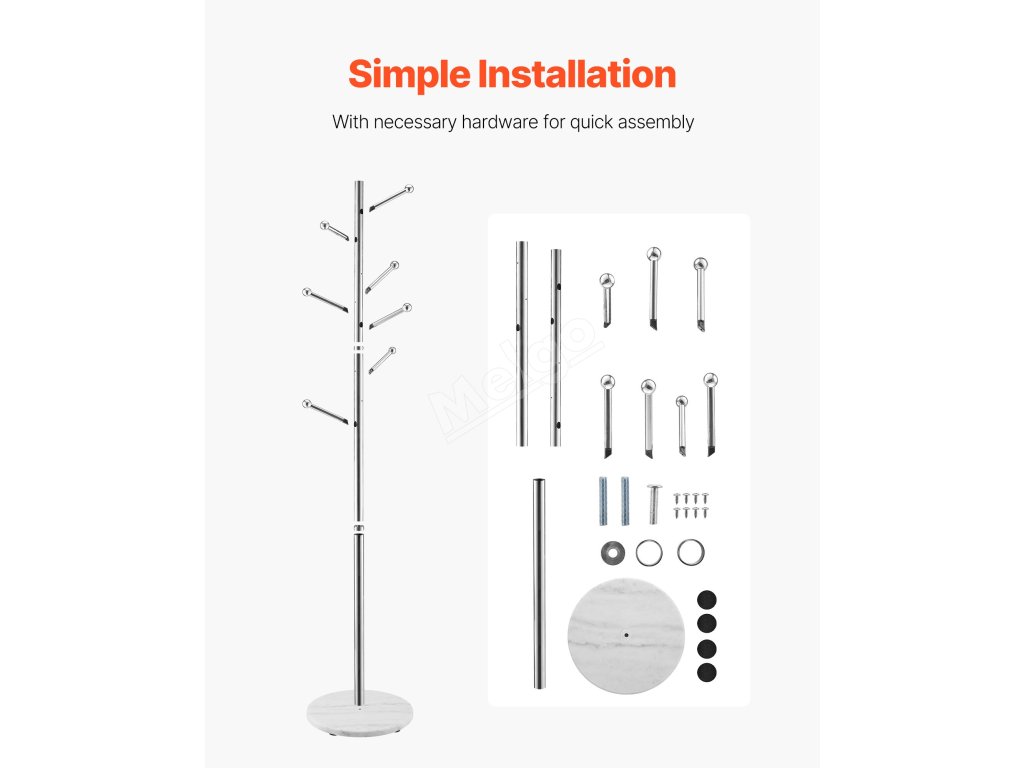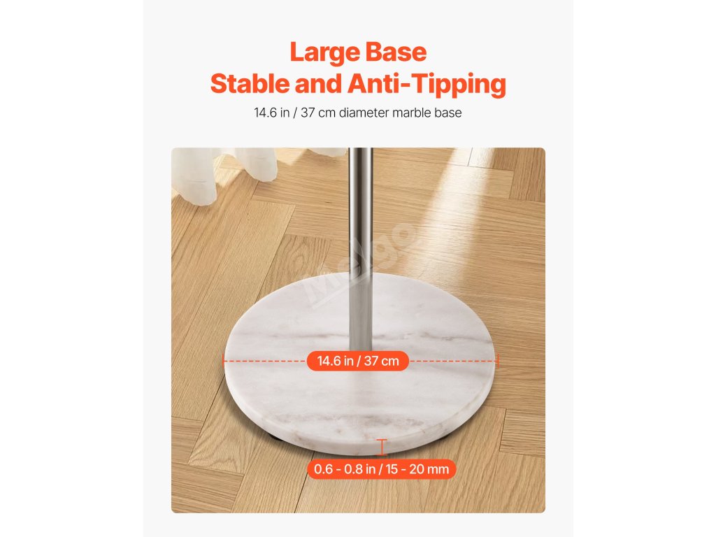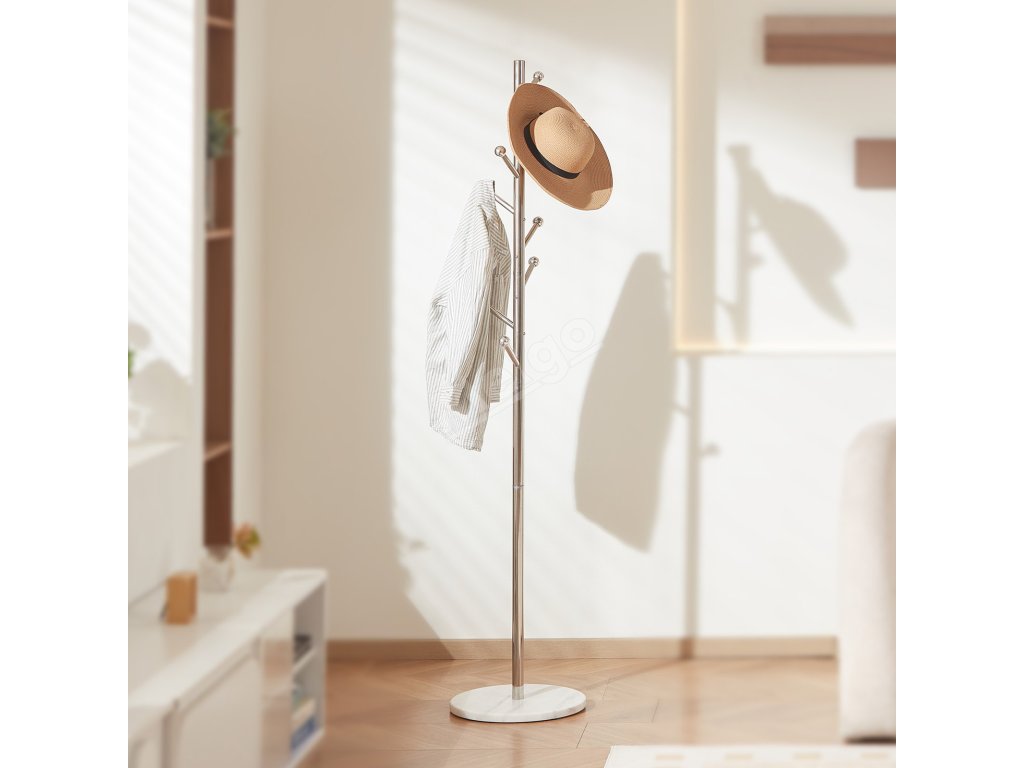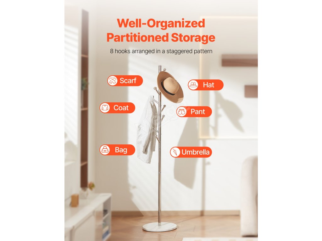 S volně stojícím věšákem VEVOR budou kabáty, klobouky, šály a kabelky přehledně zavěšené a uspořádané. Tento stylový věšák na oblečení má stabilní mramorovou základnu, 8 šachovnicově uspořádaných háčků a zesílenou hlavní tyč z nerezové oceli - ideální do vstupních prostor, ložnic, kanceláří nebo obývacích pokojů.