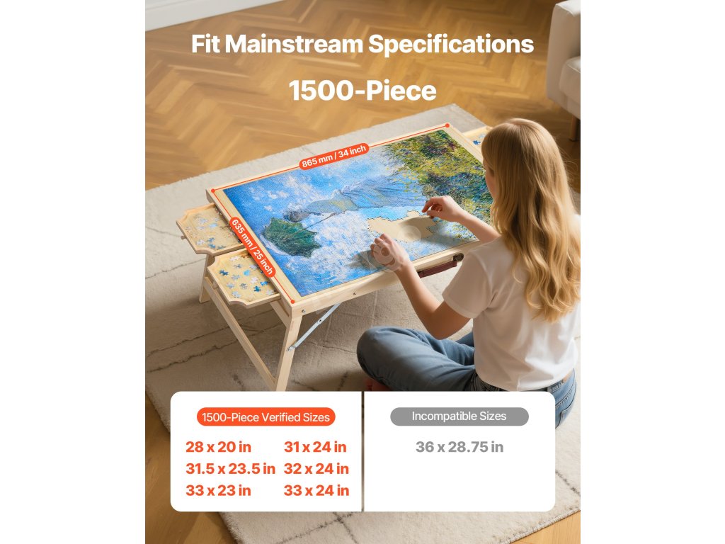 Naše desky na puzzle se zásuvkami a kryty mají rozměry vhodné pro většinu 1500dílných skládaček a nabízejí snadný a efektivní způsob vytváření krásných skládaček.