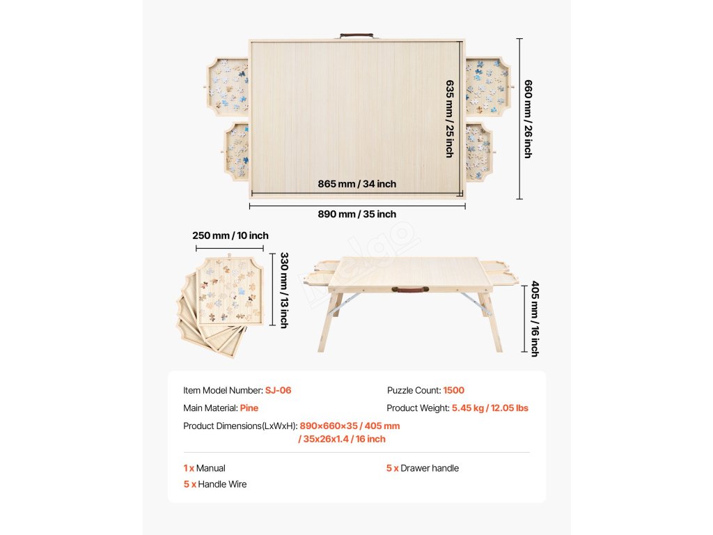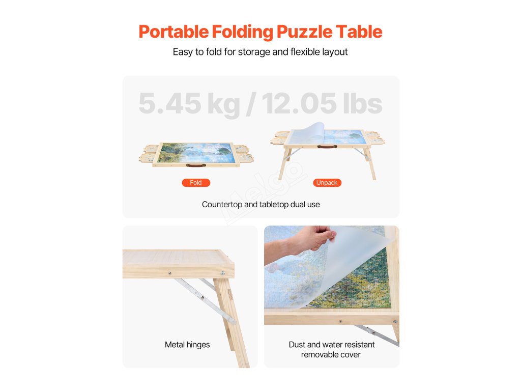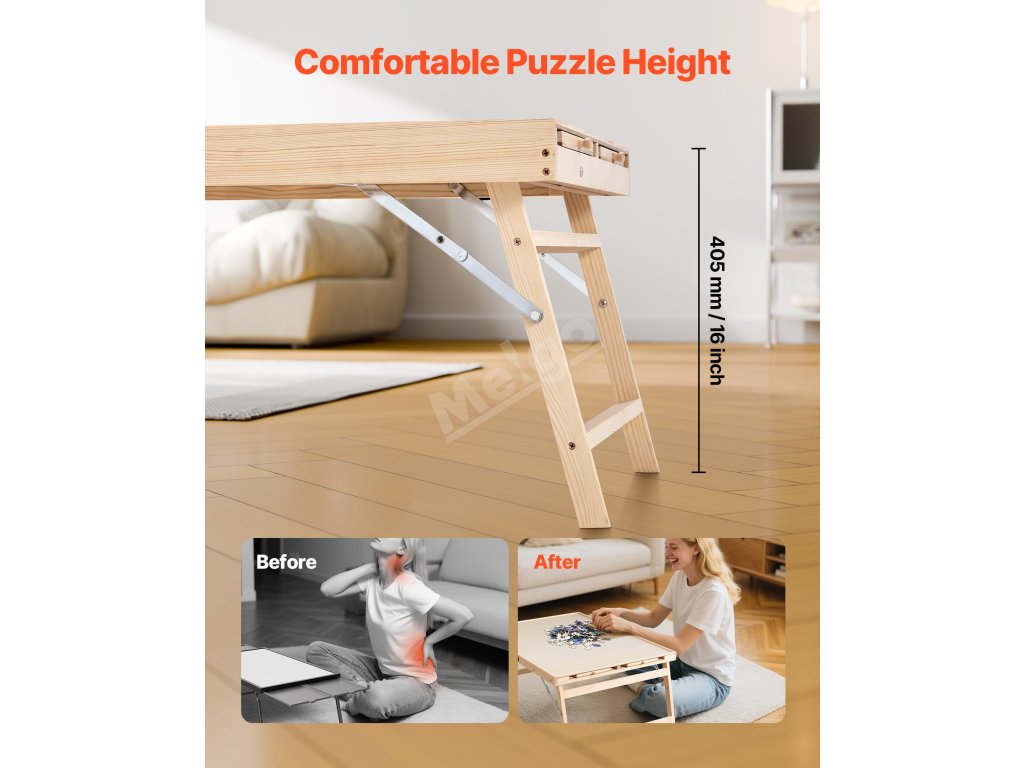 Otázka: Odpověď: Vejde se na tuto desku 1500 dílků puzzle? Tato deska je určena pro puzzle standardní velikosti s 1500 dílky. Deska má rozměry 865 × 635 mm / 34 × 25 palců, což vyhovuje většině skládaček s 1500 dílky. otázka: Jak mohu skládačku uložit, až ji dokončím? odpověď: Jak mohu skládat puzzle? Po dokončení lze puzzle složit pro uskladnění nebo zakrýt ochranným víkem, což umožňuje jeho vystavení jako dekorativního rámečku. otázka: Nebudou se skládací nohy kývat? odpověď: Velký stůl s puzzle je vyroben z přírodního borovicového dřeva, které poskytuje stabilní konstrukci. Nohy stolu jsou vyztuženy 4 kovovými panty, které odolávají jakémukoli pohybu při skládání puzzle a udržují stabilitu. otázka: Jaké jsou možnosti skládání puzzle? Je montáž obtížná? odpověď: Organizér puzzle je navržen pro okamžité použití po vybalení z krabice, takže je ideální pro kempování, cestování a další přenosné aktivity.