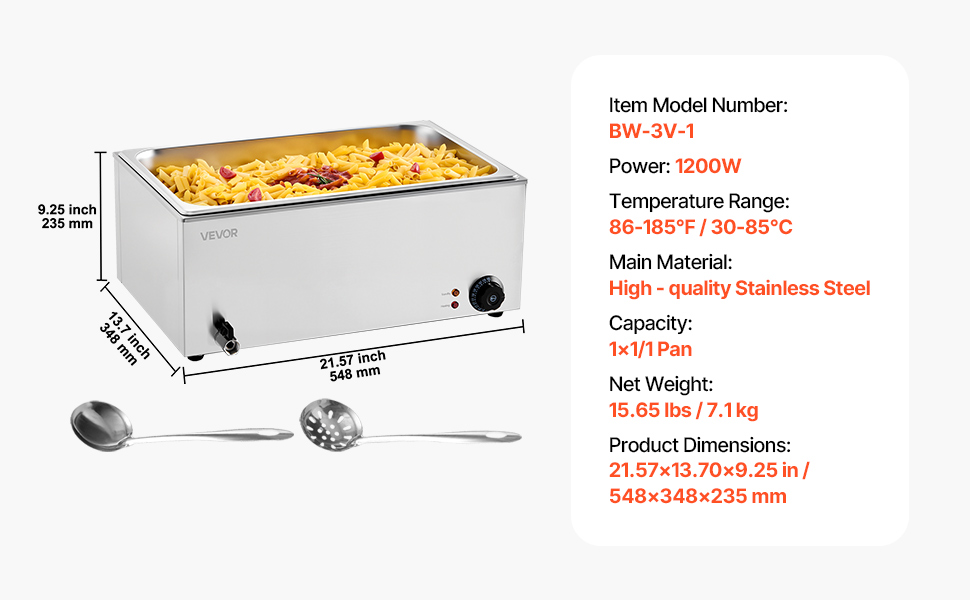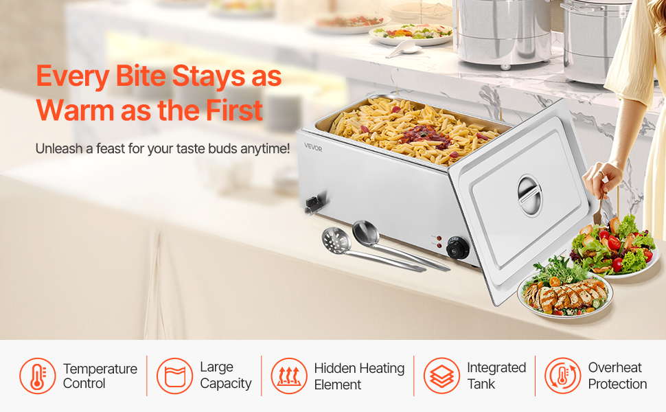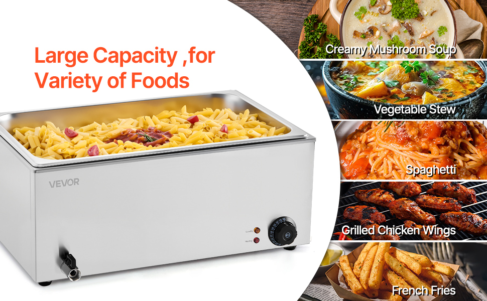Náš elektrický ohřívač potravin je dodáván s nádobou na potraviny o objemu 19qt/18l a odpovídajícím víkem, které umožňuje ohřívat více potravin najednou. Udržujte své chutné pokrmy trvale teplé po delší dobu, což je ideální pro vytížené komerční kuchyně.