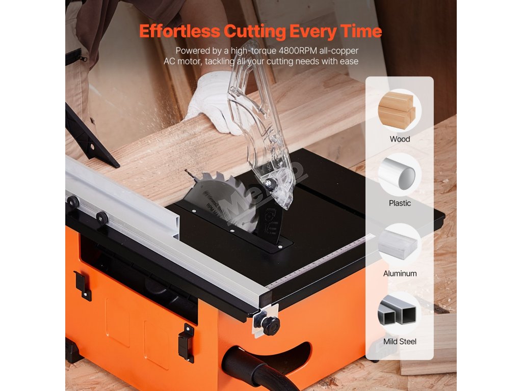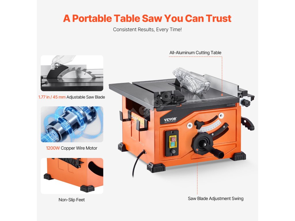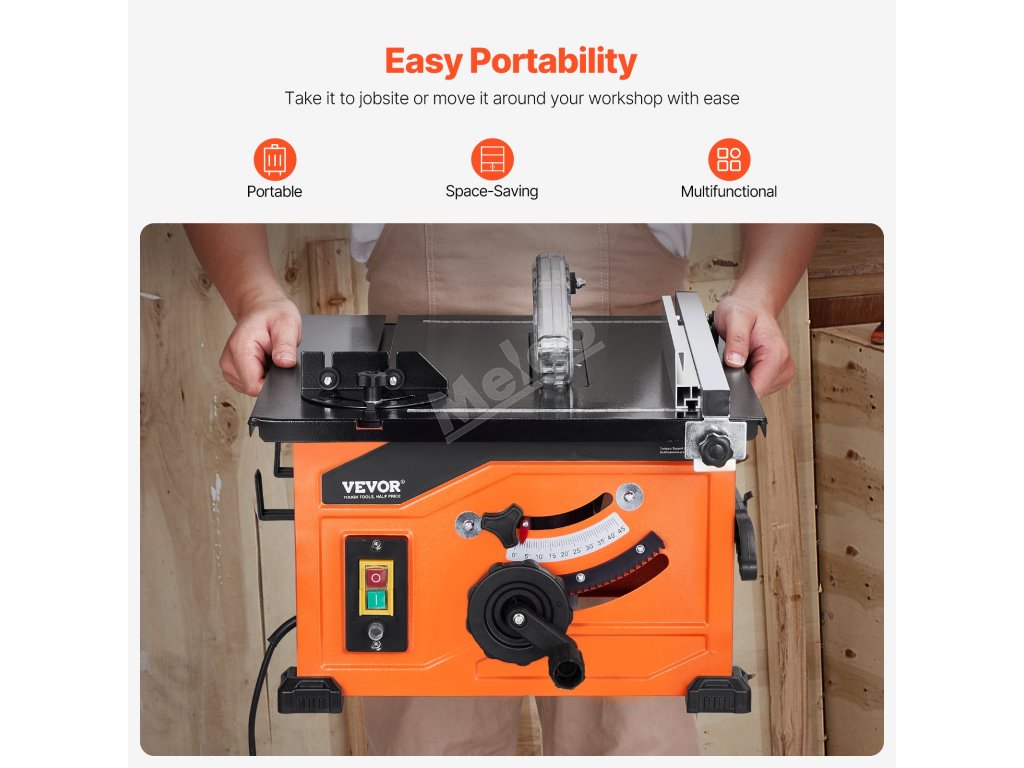 Díky své kompaktní konstrukci - velikosti běžného kufru - je tato stolní pila lehká a přenosná, takže ji můžete snadno uložit do kufru auta. Vezměte si ji na cesty na venkovní projekty nebo na staveniště a užijte si bezproblémovou přepravu, aniž by to bylo na úkor výkonu.
