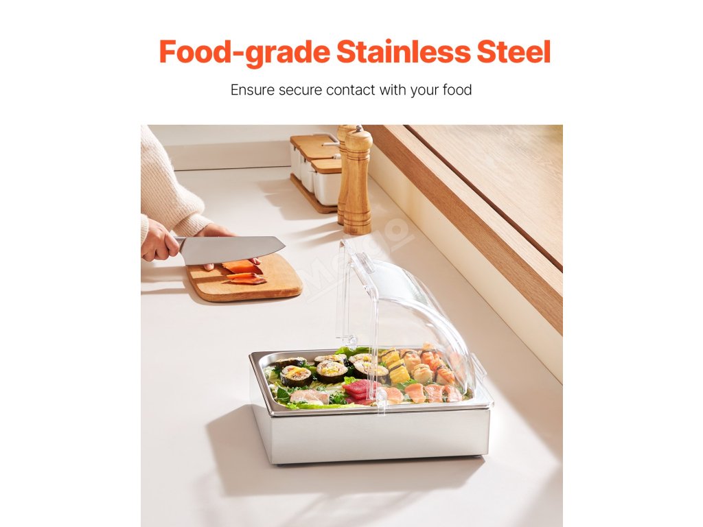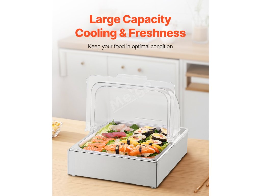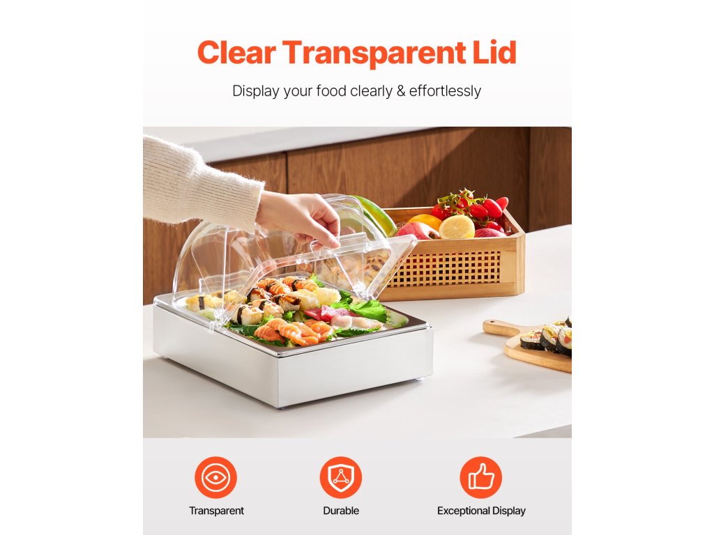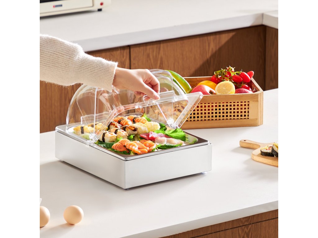 Zásobník na potraviny v našem ledem chlazeném stojanu je vyroben z potravinářské nerezové oceli, má dlouhou životnost a snadno se čistí. Kromě toho je navržen tak, aby odolal nárazům, a je vybaven průhledným víkem pro jasnou viditelnost potravin, což zajišťuje bezpečné a atraktivní skladování.