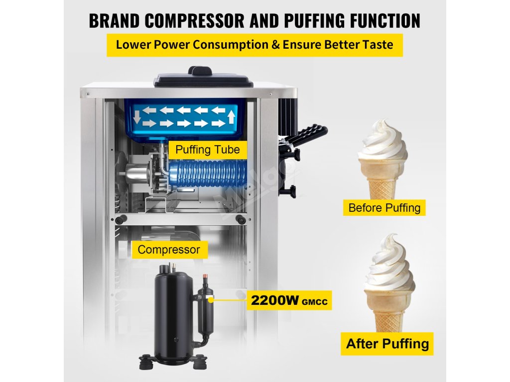 Náš nealkoholický zmrzlinovač může pracovat efektivně a stabilně díky výkonnému chladicímu systému a chladiči. Značkový kompresor o výkonu 2200 W zajišťuje nepřetržitý výkon stroje, snižuje hlučnost, šetří energii a je uživatelsky přívětivý.