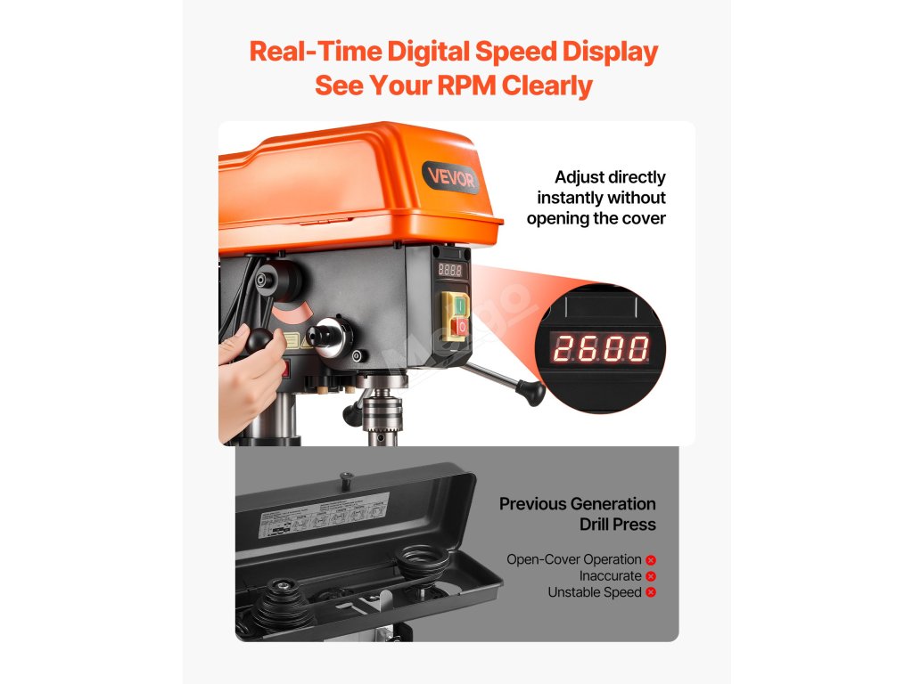 Tato stolní vrtačka s vysoce přesným vřetenem, polohováním X-laserem a LED osvětlením zajišťuje plynulé vrtání s nízkými vibracemi a přesné výsledky. Díky rozteči 254 mm a nastavitelným otáčkám od 440 do 2600 ot/min zvládá různé materiály a úkoly s vysokou účinností.