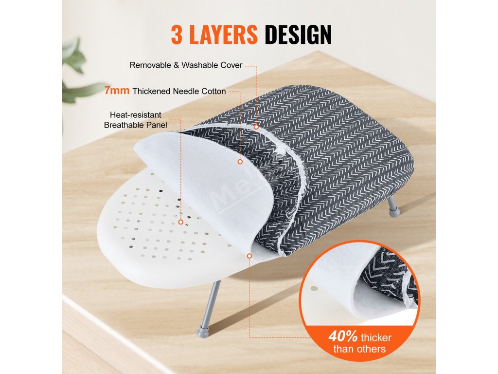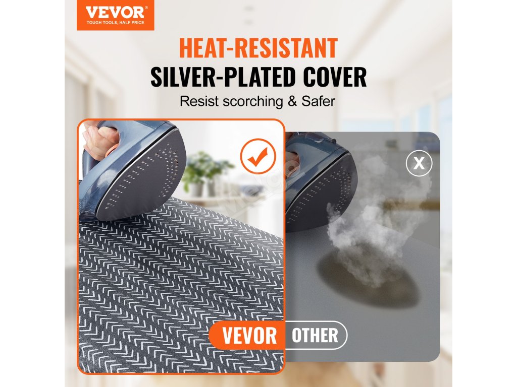 Žehlicí prkno VEVOR vyniká třívrstvou konstrukcí. Díky odnímatelnému potahu, 7 mm silné jehlou děrované bavlněné vrstvě a tepelně odolnému prodyšnému panelu zajišťuje účinné odstraňování záhybů.