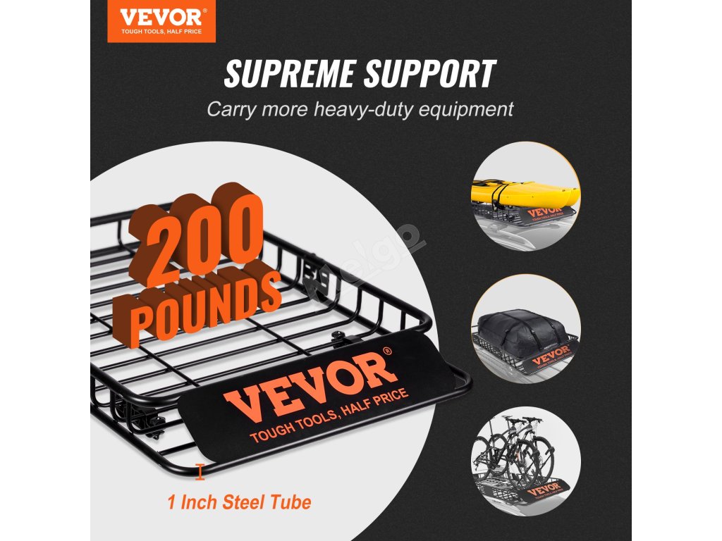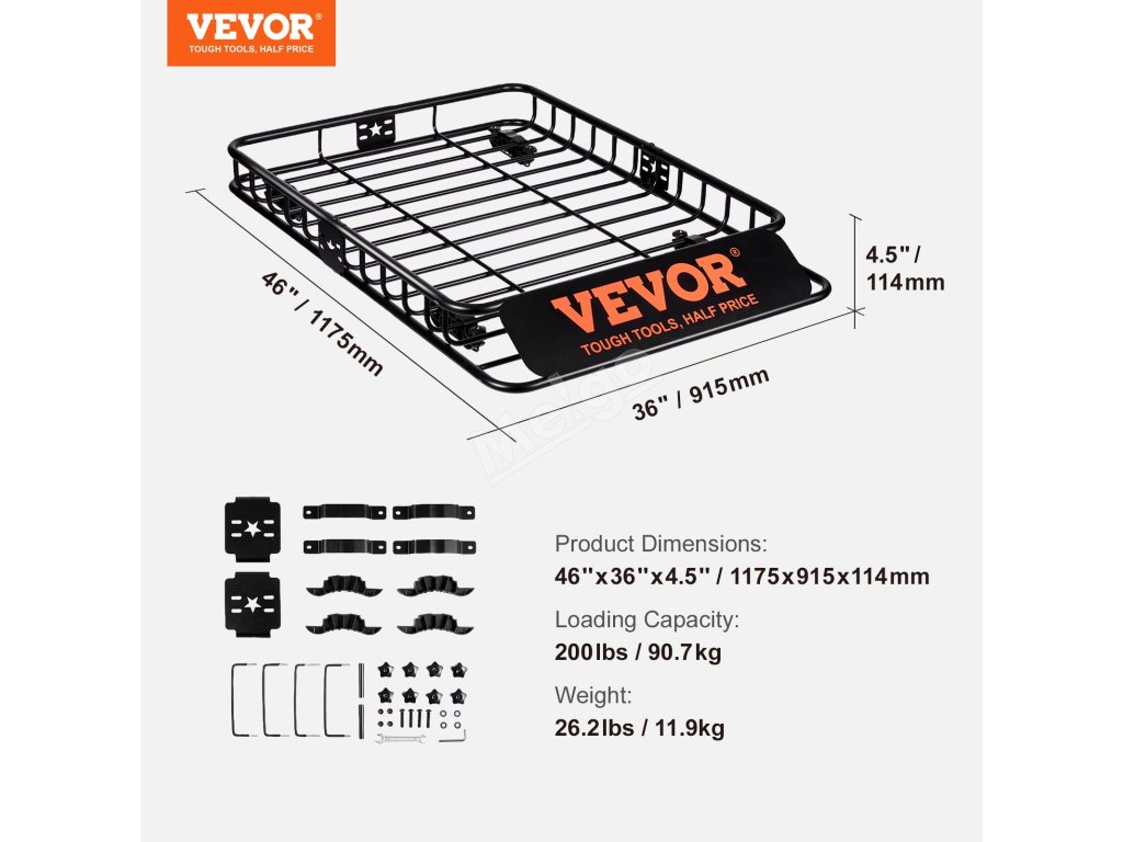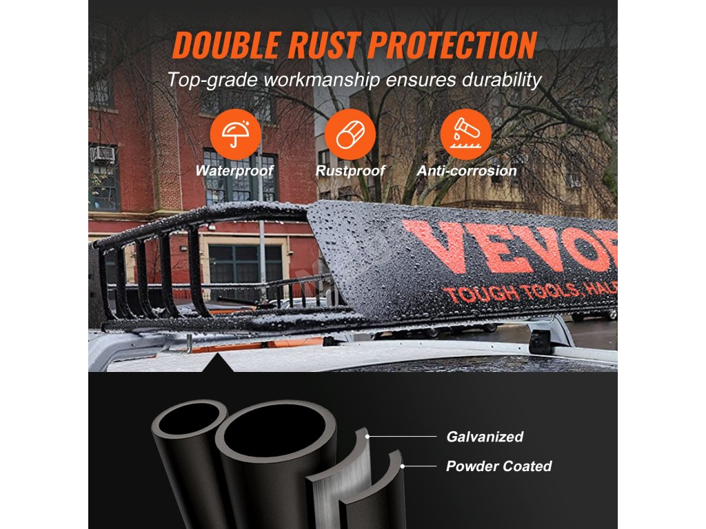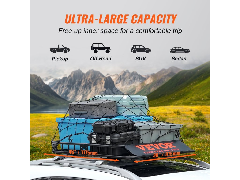Maximálna nosnosť koša na náklad strešného nosiča VEVOR je 200 lbs. Vďaka tomu sa zvyšuje funkčnosť vášho vozidla. Zvyšuje mobilitu vozidla. Vďaka tejto vysokej kapacite môžete prevážať ťažšie predmety, ktoré sa nemusia zmestiť do vozidla. Pevná konštrukcia zaručuje, že kôš zvládne túto hmotnosť bez toho, aby bola ohrozená bezpečnosť. Využijete ho pri dlhých cestách alebo pri preprave objemných predmetov. Vďaka zvýšenej funkčnosti sa košík stane cenným doplnkom každého vozidla a zlepší jeho celkovú využiteľnosť. Táto pridaná kapacita môže výrazne zlepšiť to, čo môžete prepravovať. Vaše cesty sa vďaka tejto dodatočnej kapacite stanú pohodlnejšími.