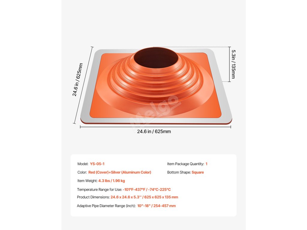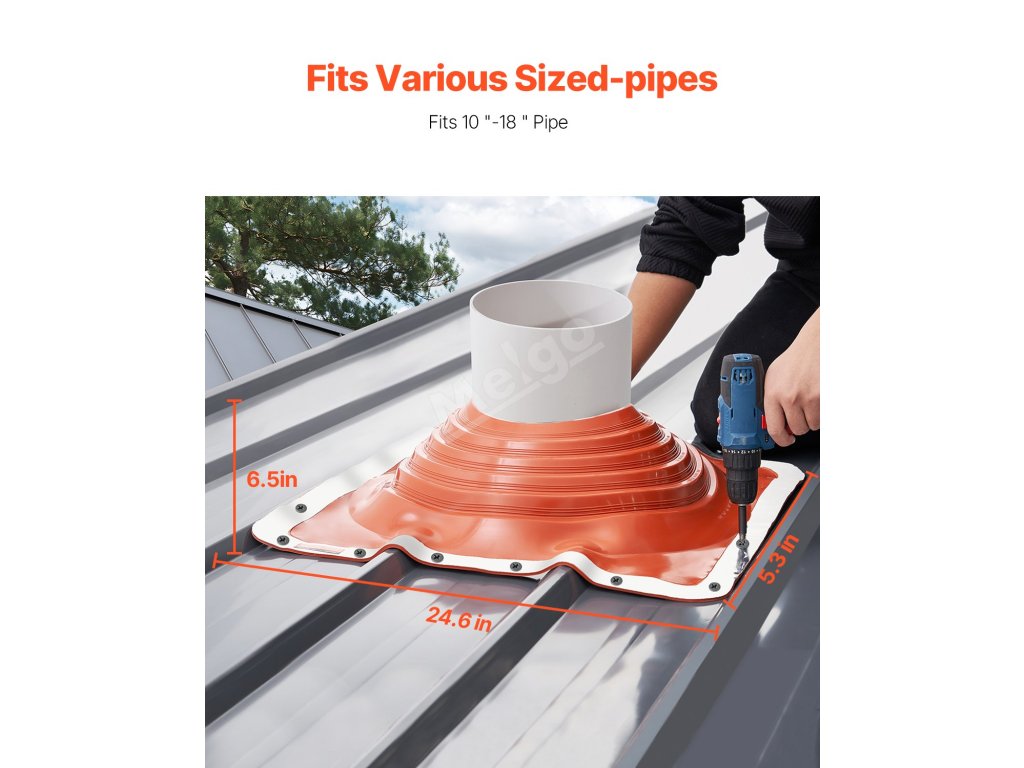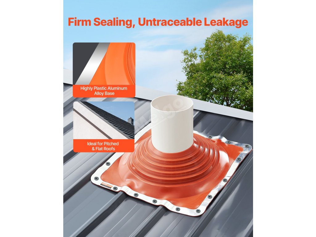 Obal na strešné rúry je vhodný pre rúry s priemerom 10" až 18". Vďaka silikónovému krytu odolnému voči korózii prekonáva vysoké teploty a nízke mrazy. Flexibilná hliníková základňa umožňuje jednoduché rezanie & inštaláciu, zvládne rôzne strešné materiály a sklony. Odolná & tesne tesniaca, je ideálnou voľbou pre netesnosti strešných rúr.