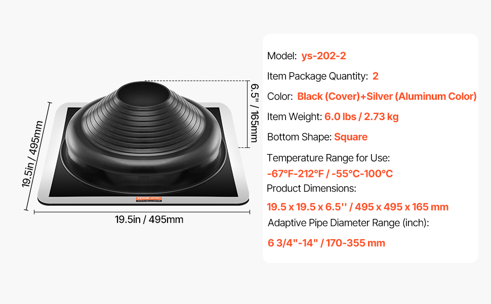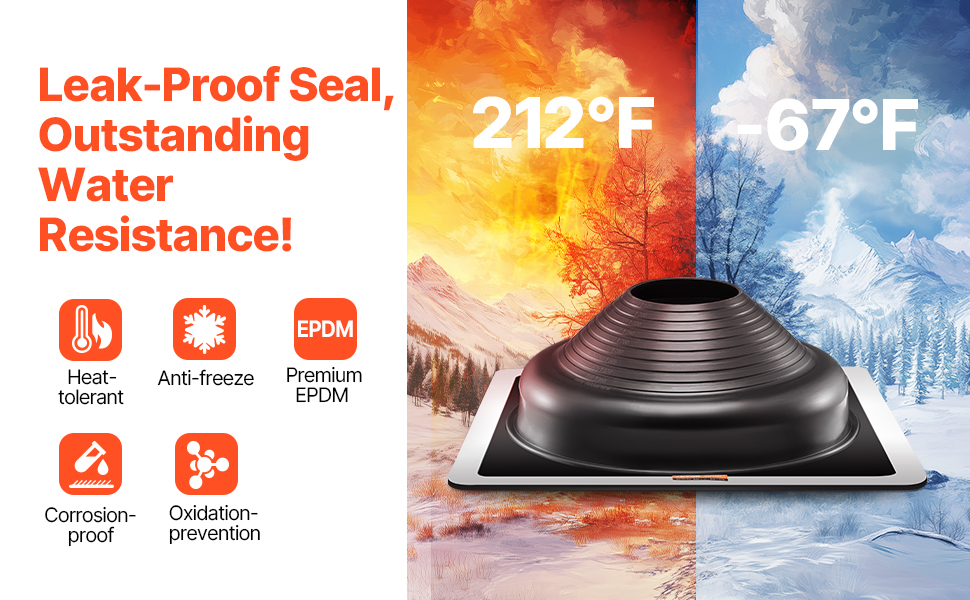 Kryt střešního potrubí je vhodný pro potrubí o vnějším průměru 6-3/4" až 14". Díky krytu z EPDM odolnému proti korozi odolává vysokým teplotám a mrazu. Pružná hliníková základna umožňuje snadné řezání a instalaci a zároveň se přizpůsobí různým materiálům a sklonům střechy. Díky své odolnosti a těsnosti je ideální volbou pro střešní trubky, kterými zatéká.