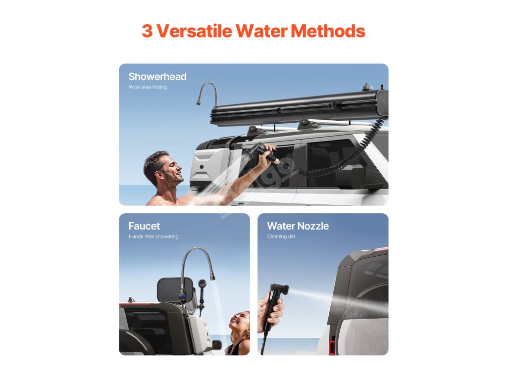 Tento střešní řadový zásobník vody je vybaven snadno čitelným štítkem s teplotou a prodloužením kohoutku. Díky tomu tato sestava umožňuje venkovní sprchování bez použití rukou, což je pro venkovní použití pohodlnější.