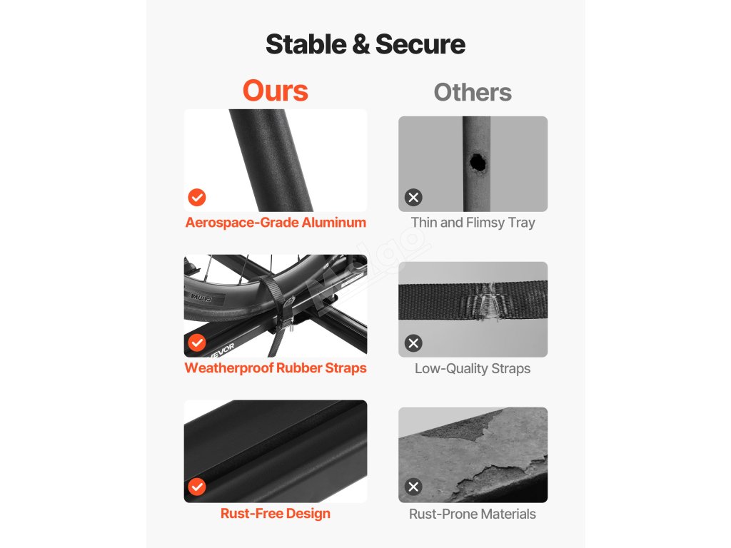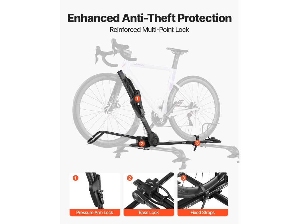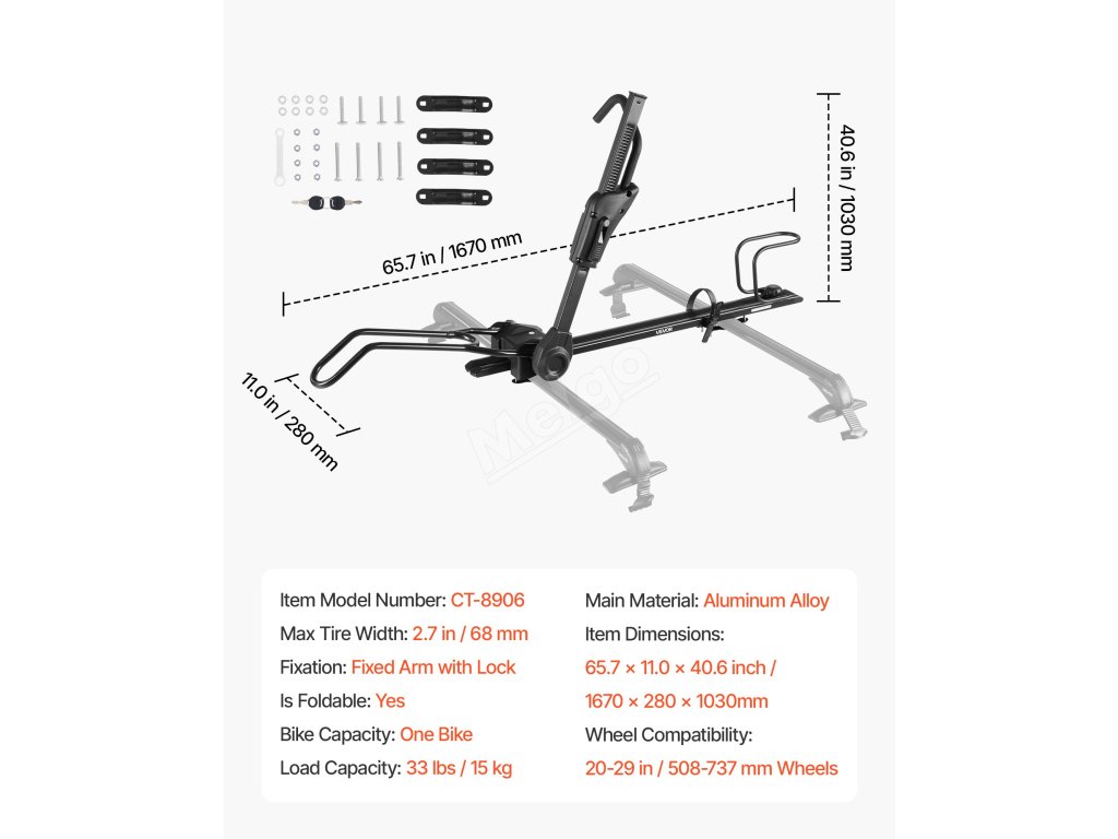 Nosič unese až 33 liber (15 kg) na kolo. Obsahuje zámky proti krádeži, gumové popruhy a bezpečné upínací rameno, které zajišťují stabilní přepravu bez starostí.