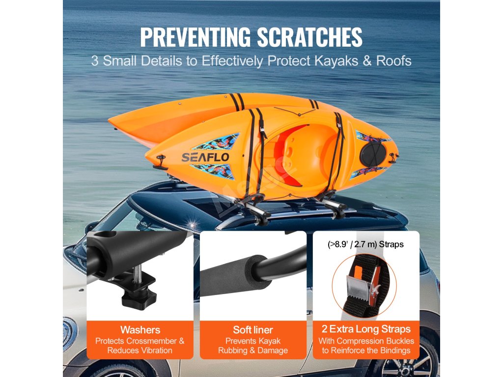 Držák kajaku má nejen speciální místo, které zabraňuje poškrábání od nárazu kajaku, ale také několik měkkých drsných podložek a podložek pro snížení tření a vibrací.