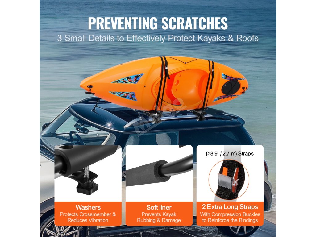 Držák kajaku má nejen speciální místo, které zabraňuje poškrábání od nárazu kajaku, ale také několik měkkých drsných podložek a podložek pro snížení tření a vibrací.