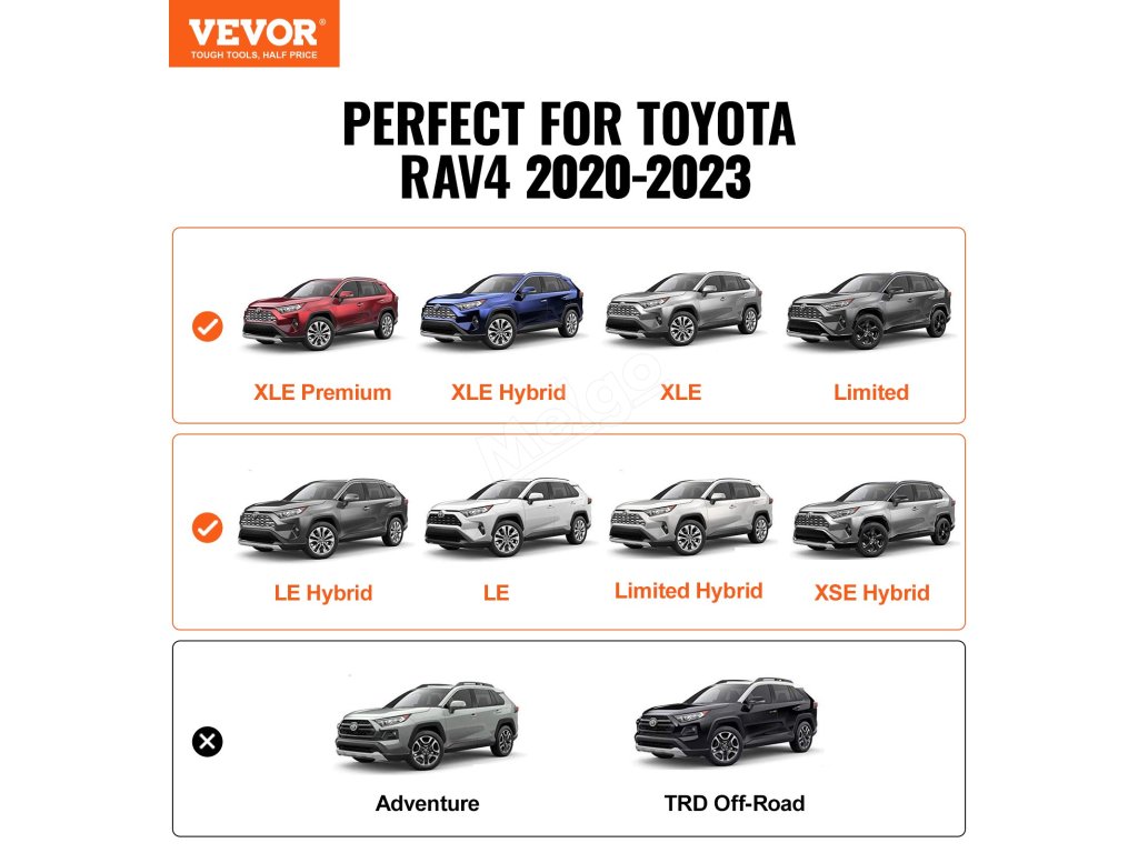 Naše příčníky jsou speciálně navrženy tak, aby dokonale pasovaly na modely Toyota RAV4 2019-2023 a zajistily hladkou a tichou jízdu během vašich cest. Upozorňujeme, že nejsou kompatibilní s modely Adventure, TRD Off-Road a dalšími modely, které mají zvýšené boční tyče.