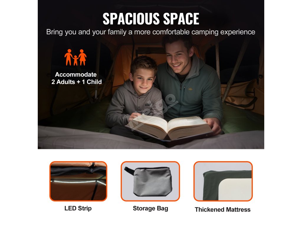 Tento střešní stan je určen pro rodiny, které milují venkovní dobrodružství. Nabízí prostorný prostor, do kterého se vejdou 2 dospělí a 1 dítě, a dveře a okna, která poskytují rozsáhlý výhled a umožňují plně si vychutnat skvělý výlet. Odolný stan vydrží mnoho dalších dobrodružství.