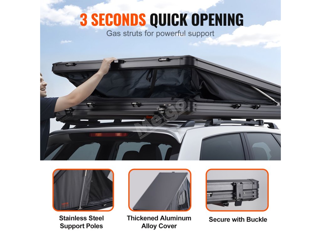 Hliníkový pevný plášť je odolný a nárazuvzdorný, zatímco podpěrné tyče z nerezové oceli stan hladce postaví během pouhých 3 sekund.