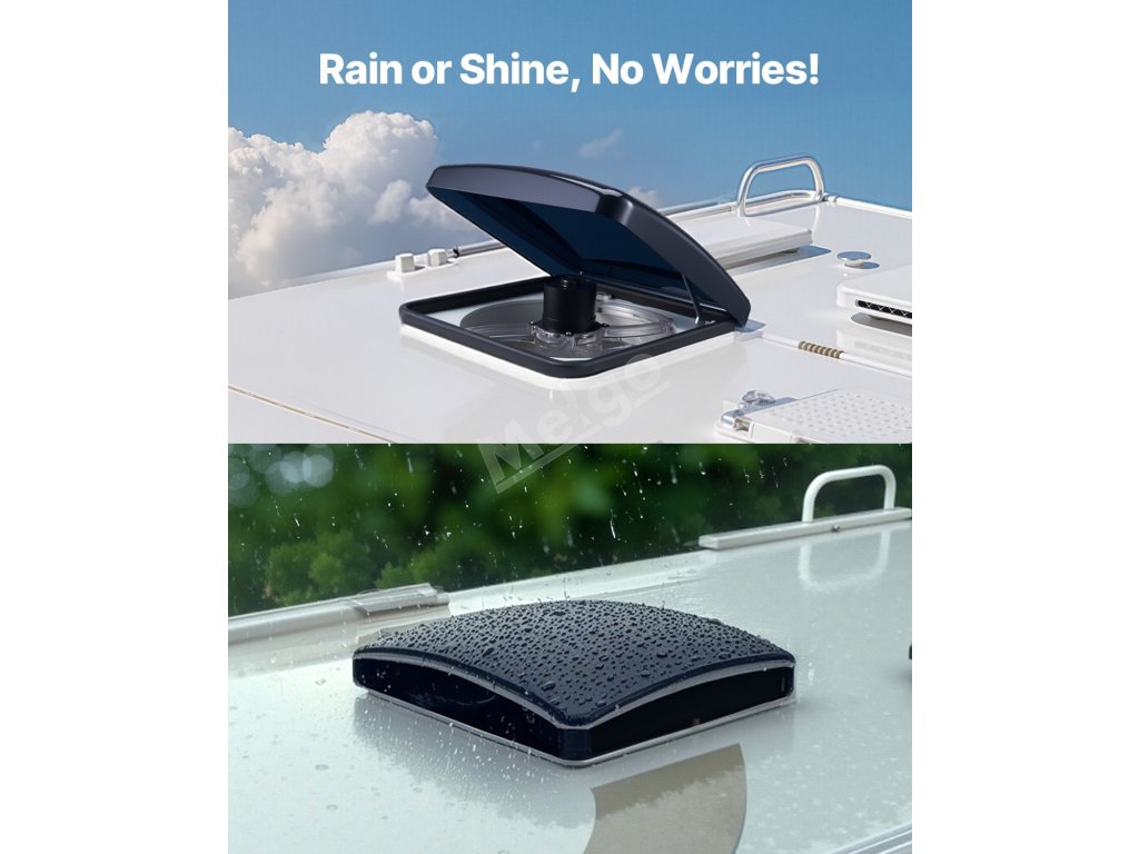 Žiadne starosti počas daždivých dní - vzduch vo vašom RV zostane svieži! Ventilátor sa automaticky vypne, keď zistí dážď, aby sa zabránilo poškodeniu predmetov v interiéri vodou. Počas slnečných dní rýchlo odsáva alebo cirkuluje vzduch, čím udržiava vzduch čerstvý!