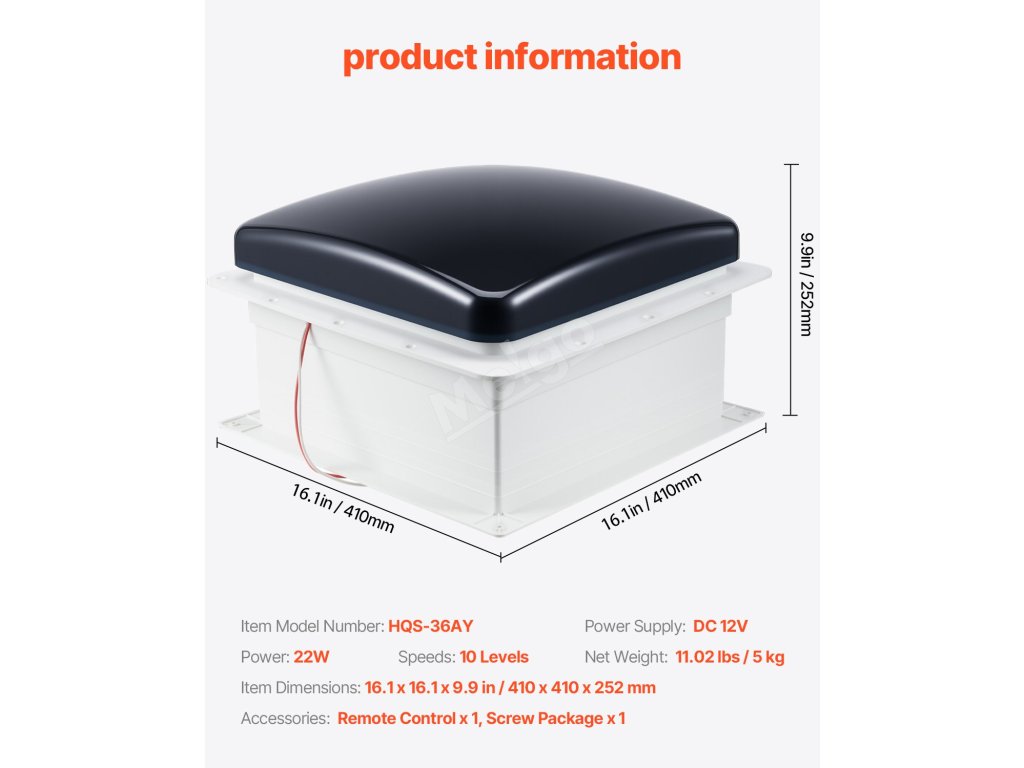 Tento strešný ventilátor pre obytné vozidlá ľahko vyrieši problémy s dusnom a vlhkosťou vo vašom obytnom vozidle! Je vybavený výkonným motorom a 10 nastaveniami rýchlosti, rýchlo odvádza teplo a vlhkosť a udržiava vo vnútri čerstvý vzduch podľa vašich potrieb.