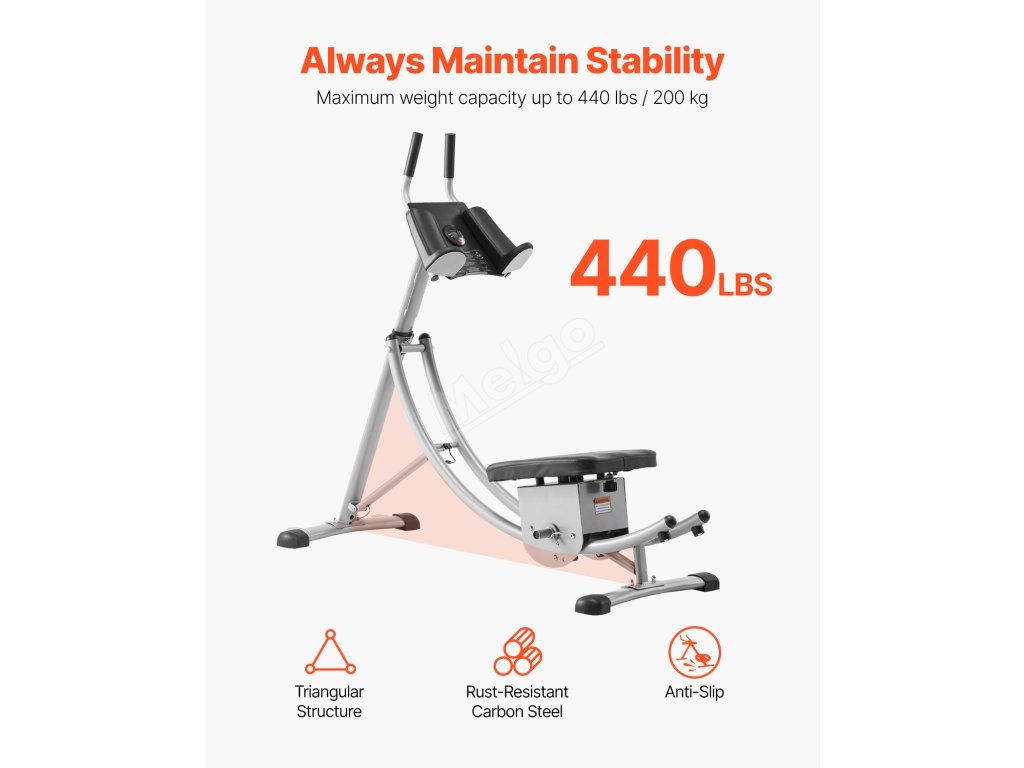 Tento trenažér na břicho, vyrobený ze zesílených trubek z uhlíkové oceli v kombinaci s ergonomickým designem a konstrukcí zlatého trojúhelníku, udrží uživatele až do hmotnosti 300 kg, aniž by se během cvičení kymácel nebo propadal.