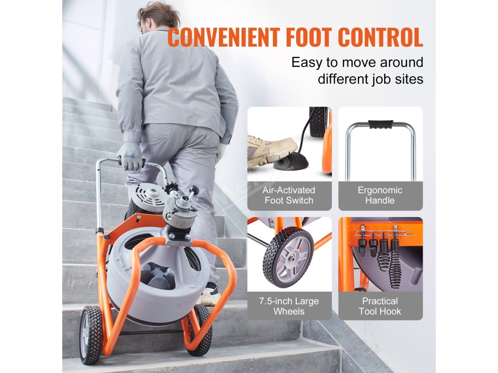 Stroj na čištění potrubí 75ft×3/8 inch, 8 fréz, 2"–4", s pedálem