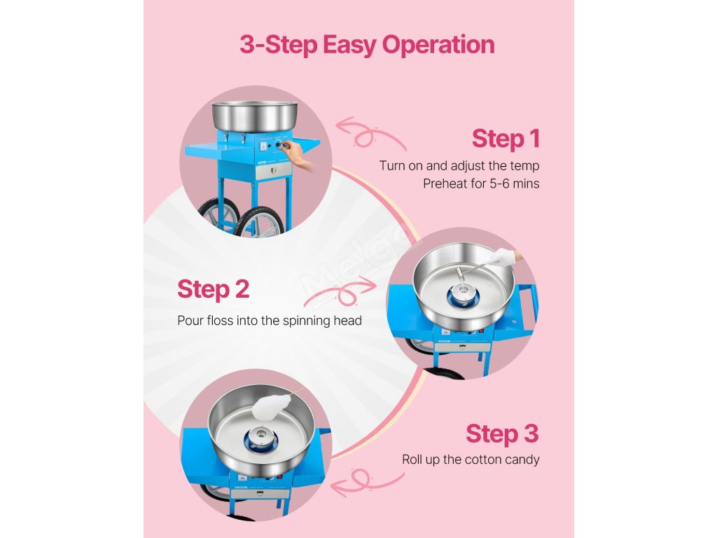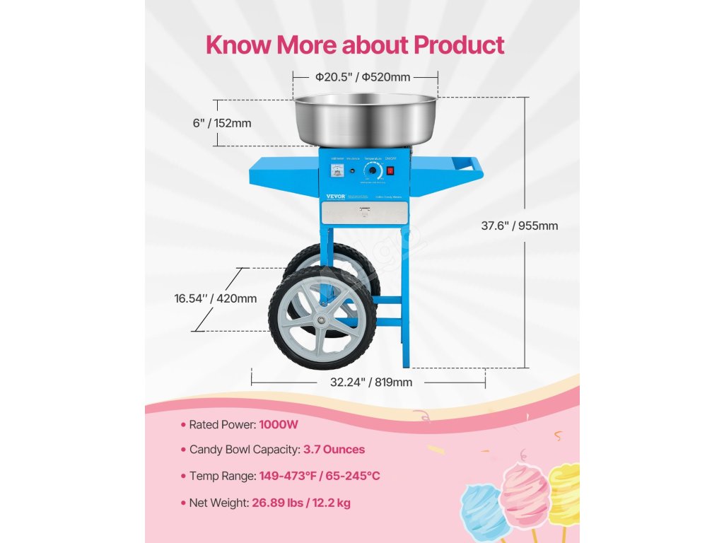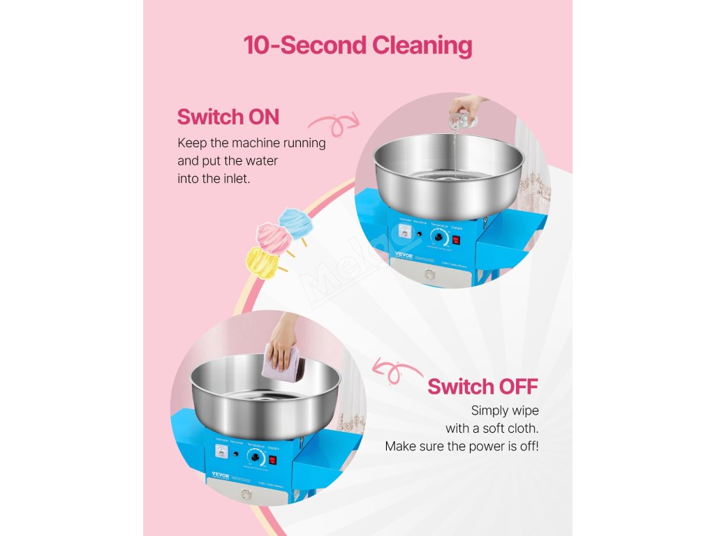 Tento strojek na cukrovou vatu má 1000W motor a větší nádobu na cukrovou vatu, která poskytuje maximálně 6 cukrových vat za minutu. Díky tomuto stroji je výroba cukrové vaty efektivnější a bez námahy.