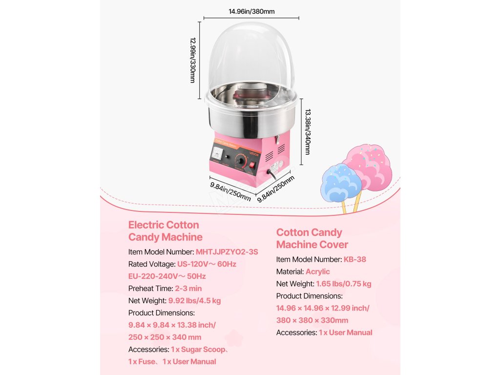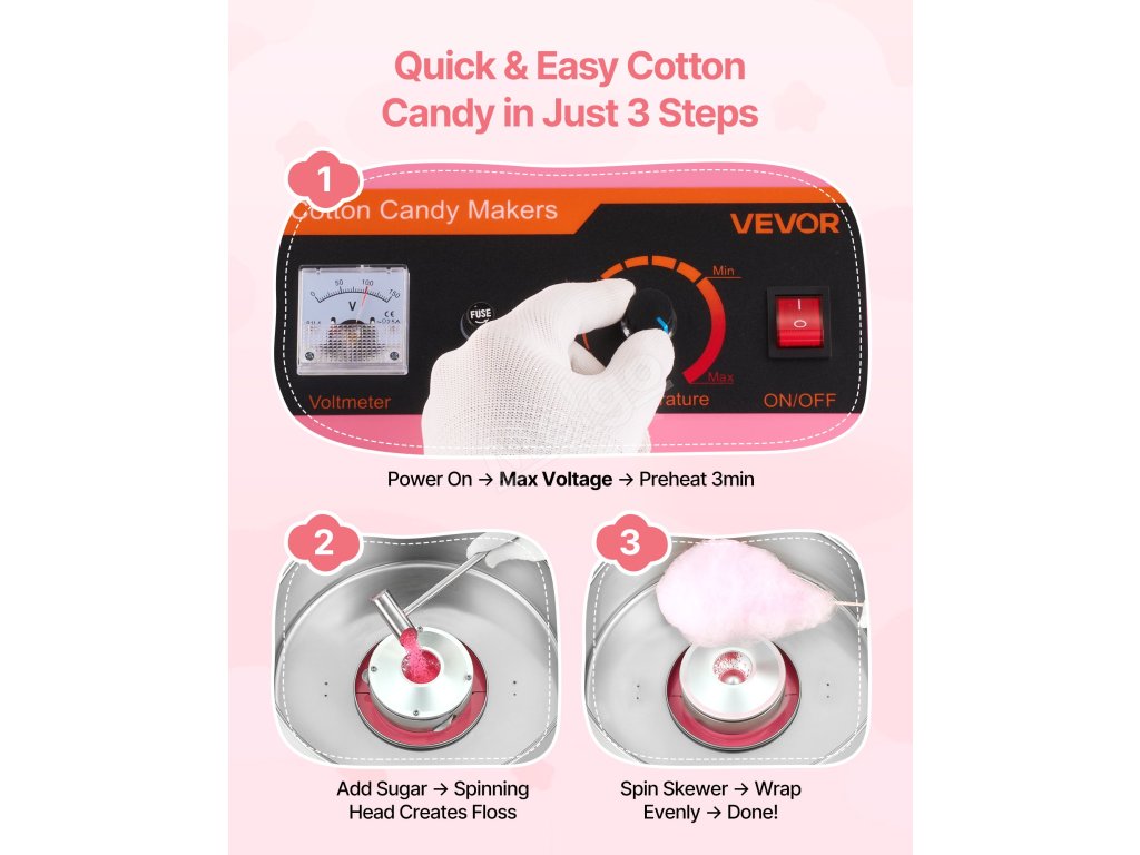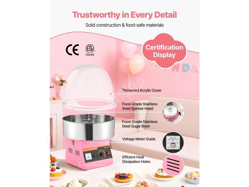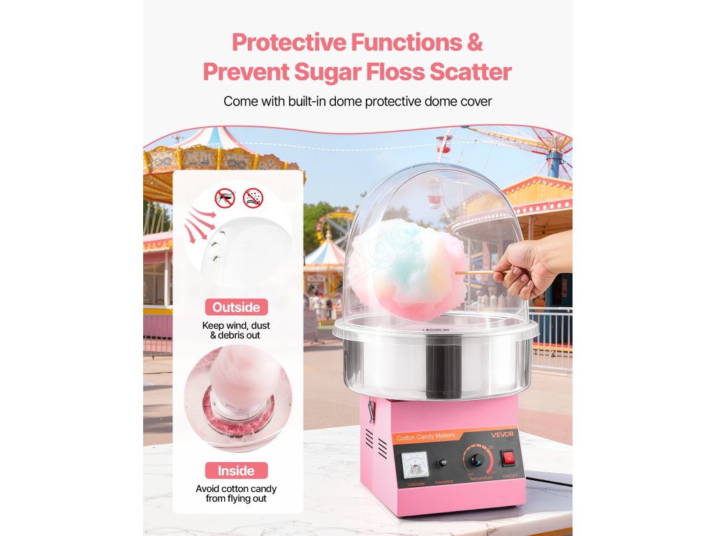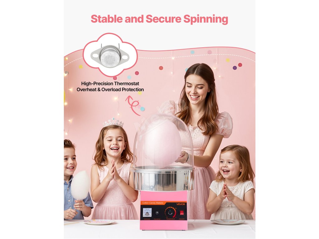 Stroj na cukrovou vatu VEVOR s kopulovitým krytem je ideální pro všechny příležitosti. Ať už se jedná o narozeninovou oslavu, oslavu svátků, setkání na zahradě nebo cukrárnu, bez námahy vnese radostnou atmosféru do jakéhokoli prostředí. Vytvořte si sladké vzpomínky kdekoli a zpříjemněte a zapamatujte si jakoukoli akci.