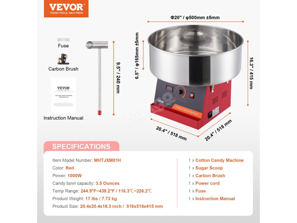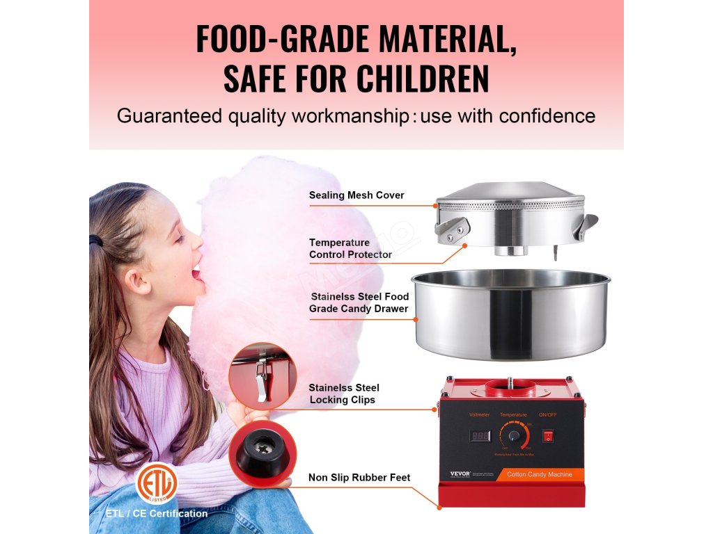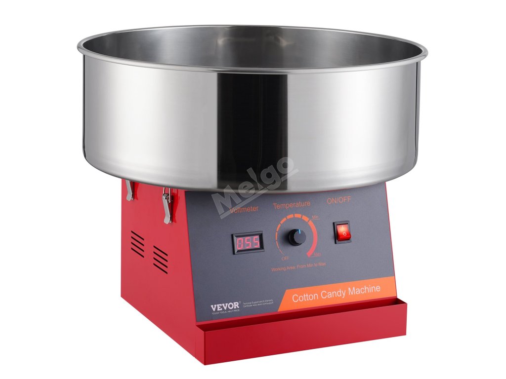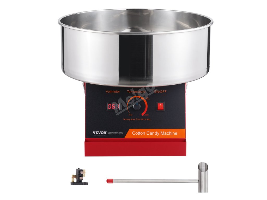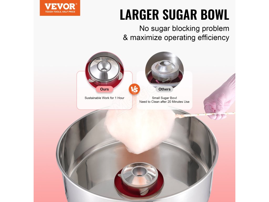 Tento výrobník cukrové vaty má 1000W motor a větší nádobu na cukrovou vatu, která poskytuje přibližně 6 cukrových vat za minutu. Tento výrobník cukrové vaty může pracovat nepřetržitě po dobu jedné hodiny. Je ideální pro různé oslavy a je vhodný pro většinu druhů cukru.
