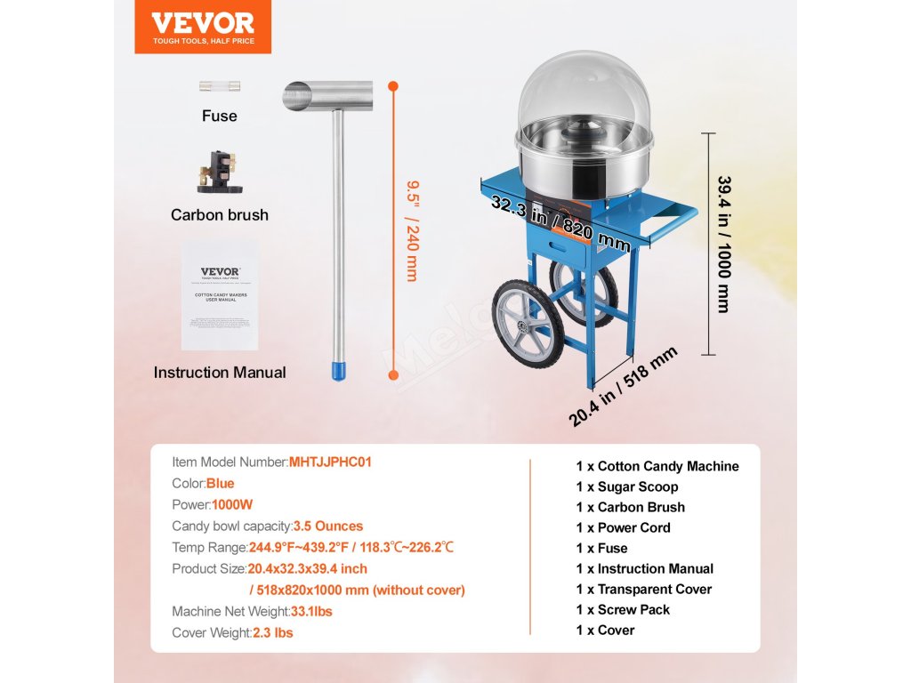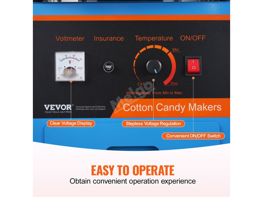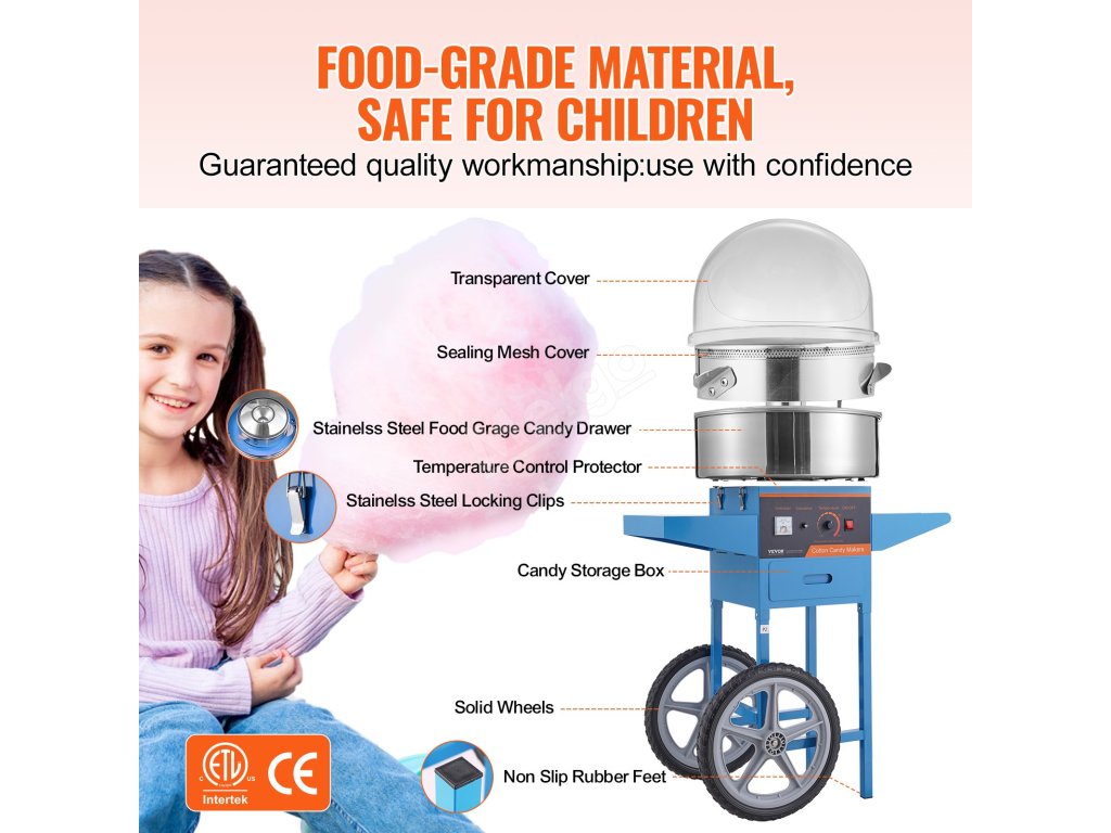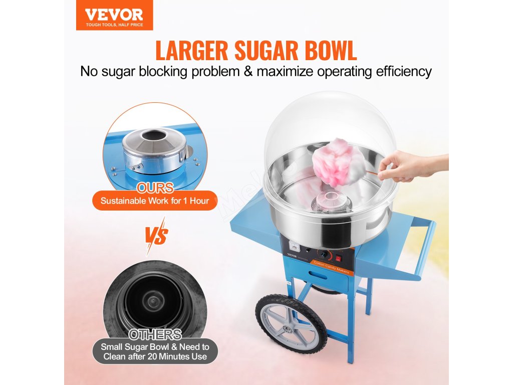 Tento výrobník cukrové vaty má 1000W motor a větší nádobu na cukrovou vatu, která poskytuje přibližně 6 cukrových vat za minutu. Tento výrobník cukrové vaty může pracovat nepřetržitě po dobu jedné hodiny. Je ideální pro různé oslavy a je vhodný pro většinu druhů cukru.
