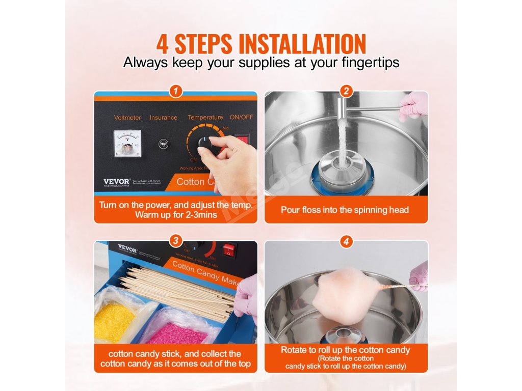 Používání tohoto přístroje nemůže být jednodušší. 4 kroky k výrobě lahodné a rozmanité cukrové vaty!